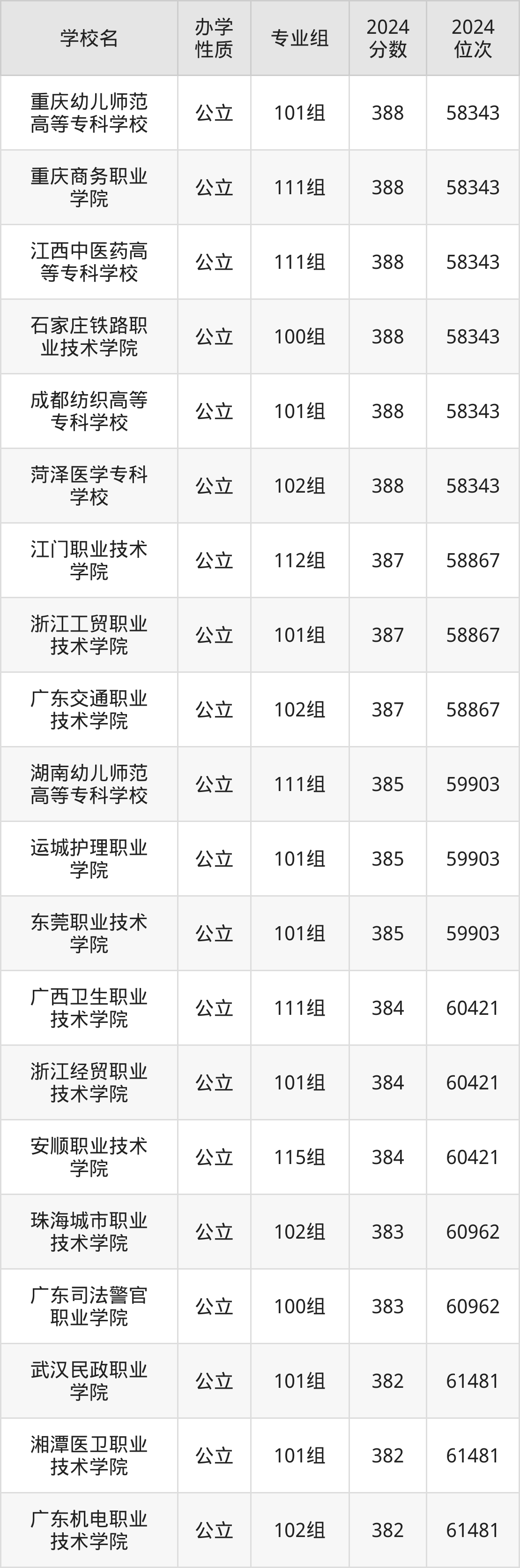 2024年广西历史类383分考生能上重庆幼儿师范高等专科学校、重庆商务职业学院、江西中医药高等专科学校、石家庄铁路职业技术学院、成都纺织高等专科学校等29所专科院校,具体录取分数线及位次为: