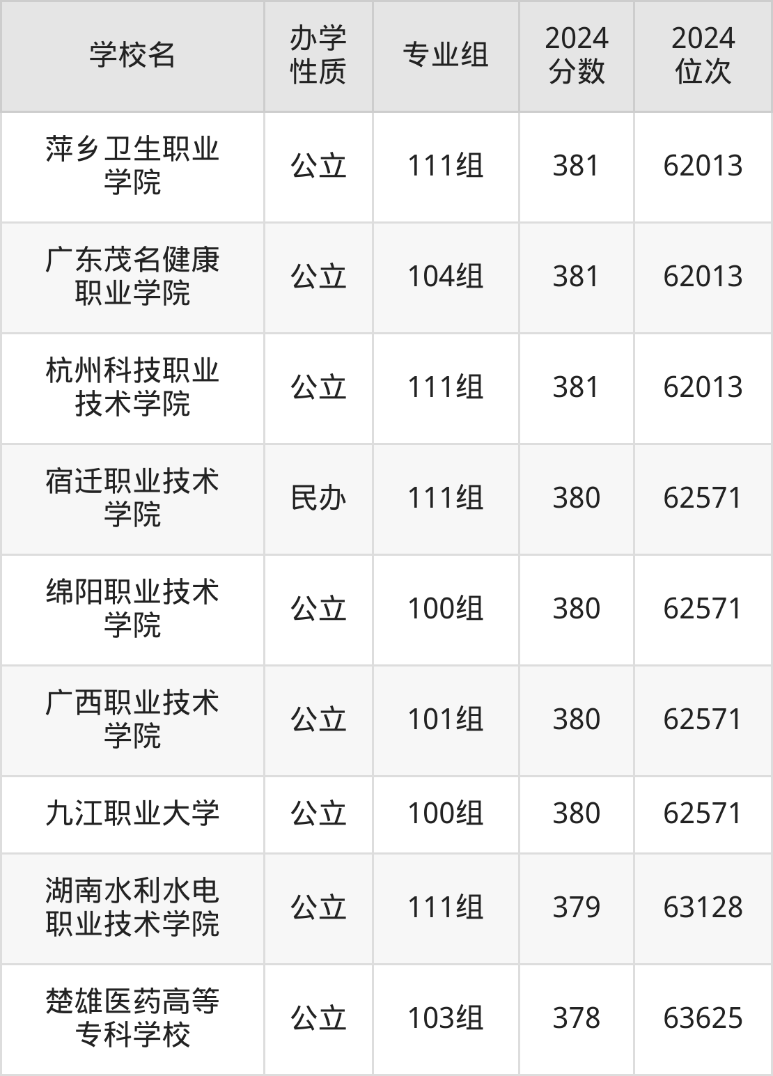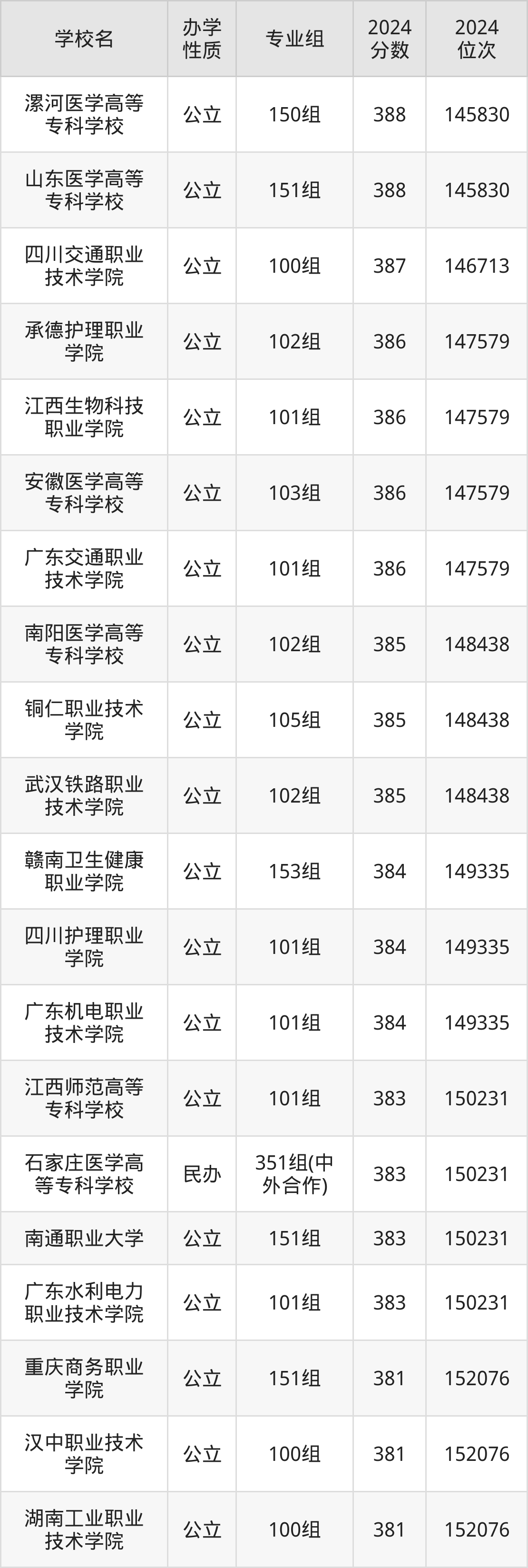 2024年广西物理类383分考生能上漯河医学高等专科学校、山东医学高等专科学校、四川交通职业技术学院、承德护理职业学院、江西生物科技职业学院等24所专科院校,具体录取分数线及位次为: