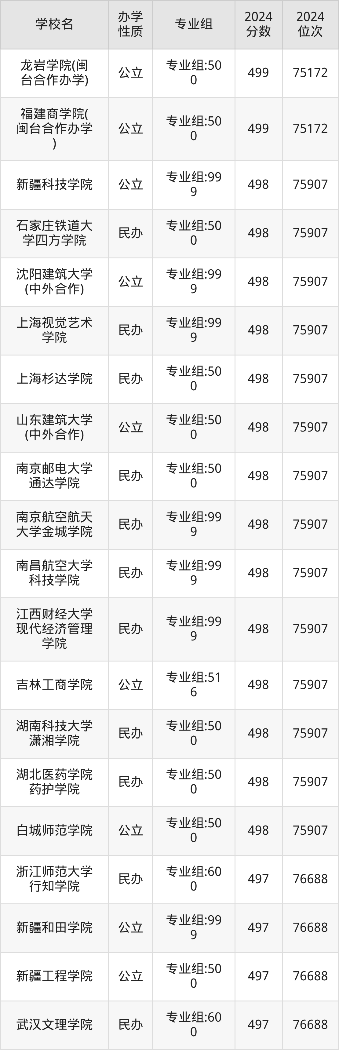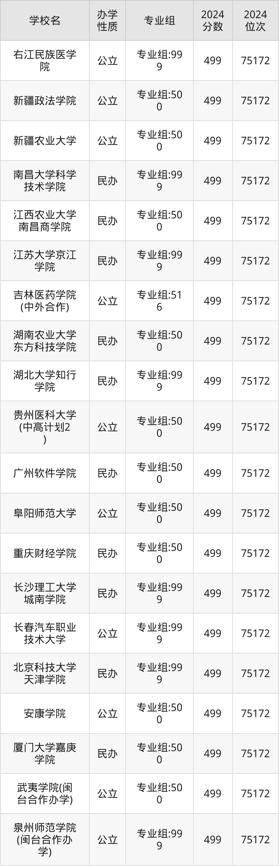 | 新疆政法学院 | 专业组:50 0 | 499 | 75172 |