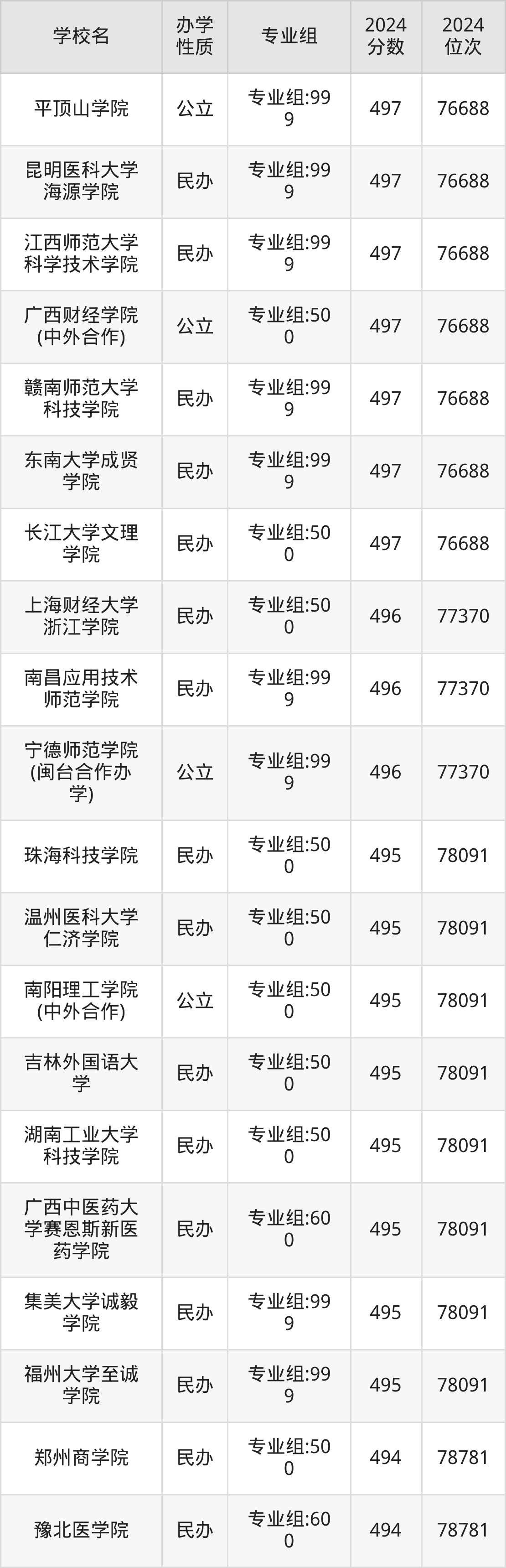 | 南昌大学共青 学院 | 专业组:50 0 | 493 | 79504 |