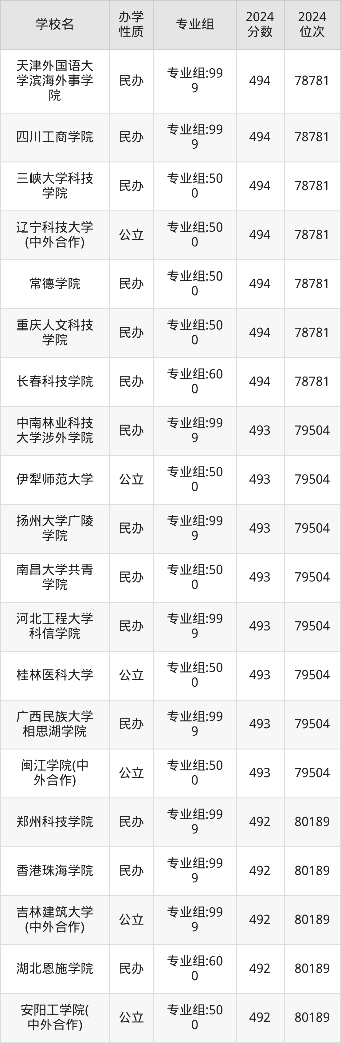 | 天津外国语大 学滨海外事学 院 | 专业组:50 0 | 493 | 79504 |