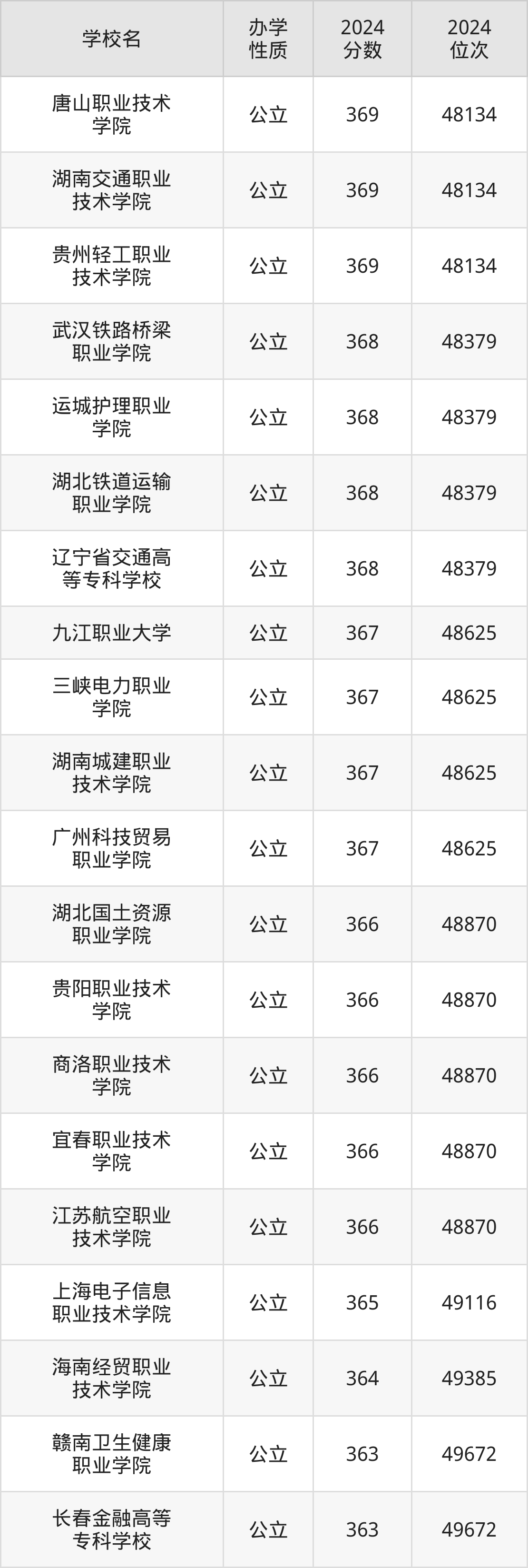 | 湖北铁道运输 职业学院 | 368 | 48379 |