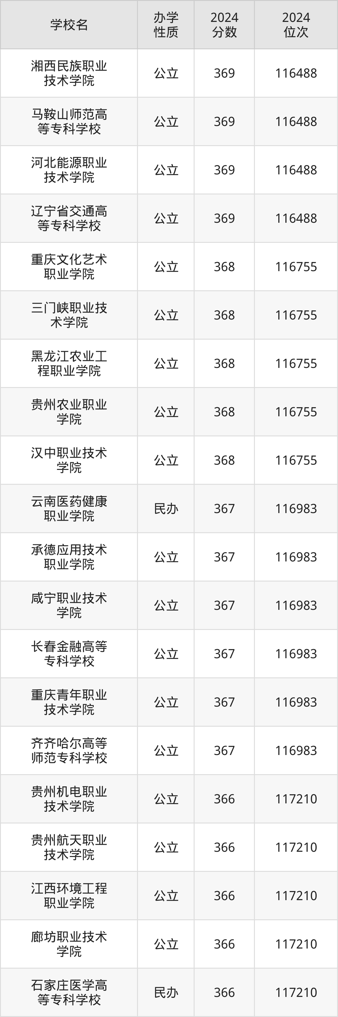 | 汉中职业技术 学院 | 368 | 116755 |