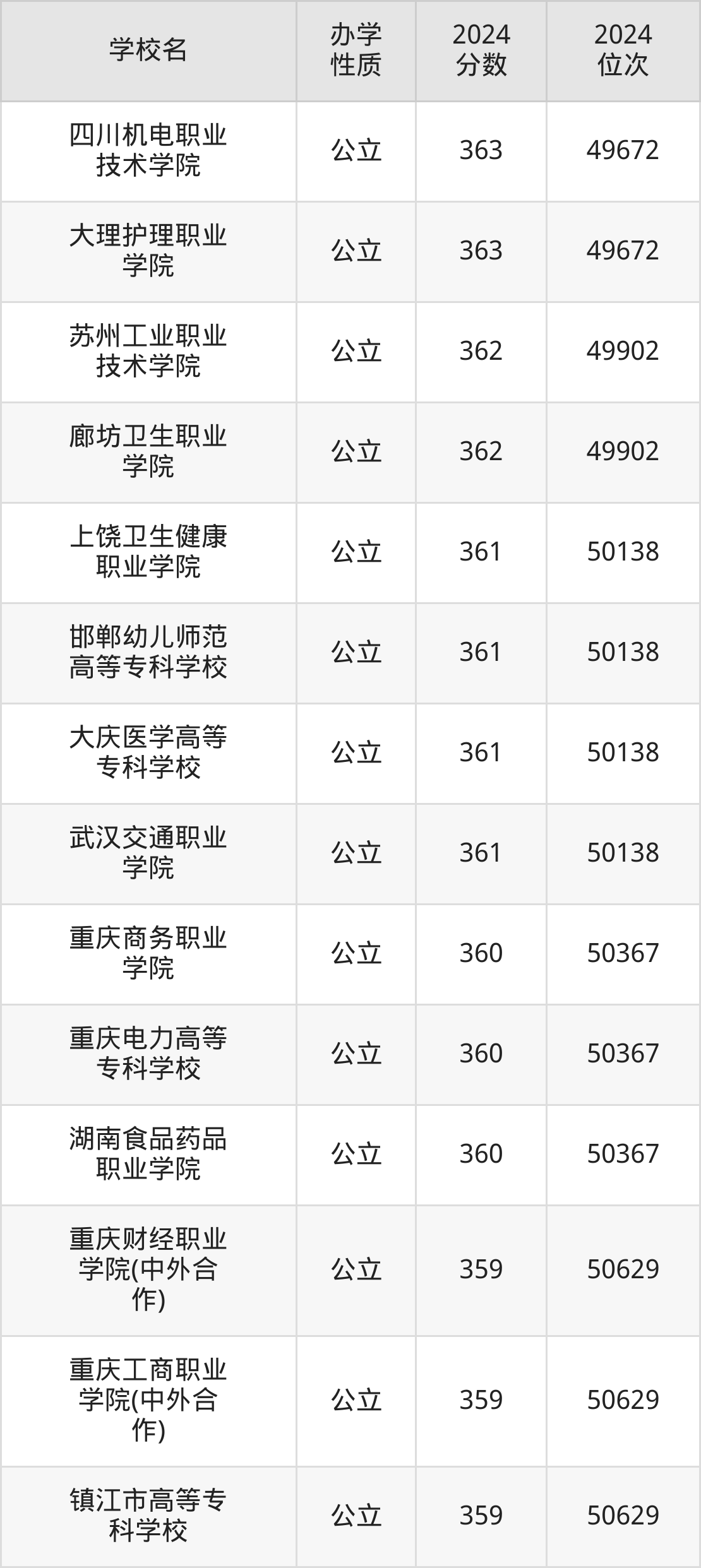 | 成都职业技术 学院 | 360 | 118575 |