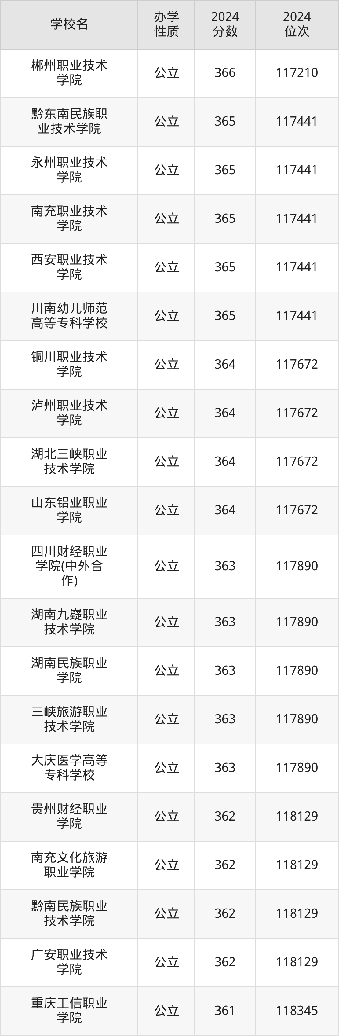 | 郴州职业技术 学院 | 366 | 117210 |