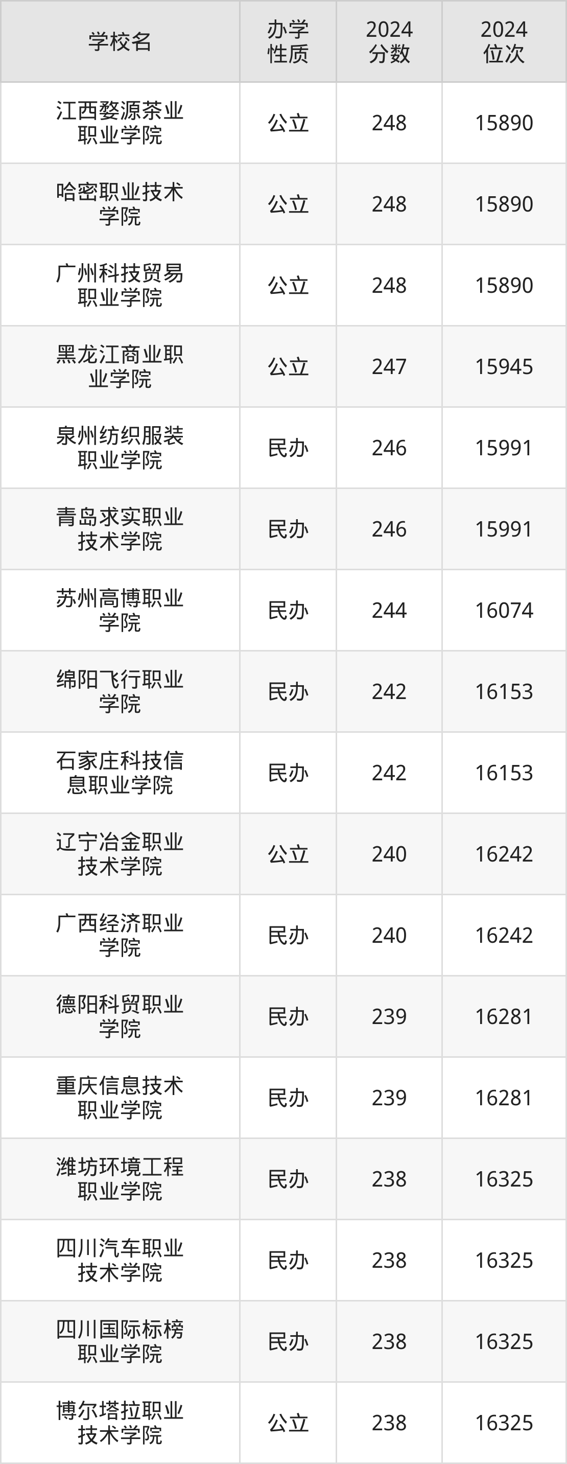 青海省243分能上专科大学,比如江西婺源茶业职业学院、哈密职业技术学院、天津商务职业学院等,更多名单可以在下文了解。