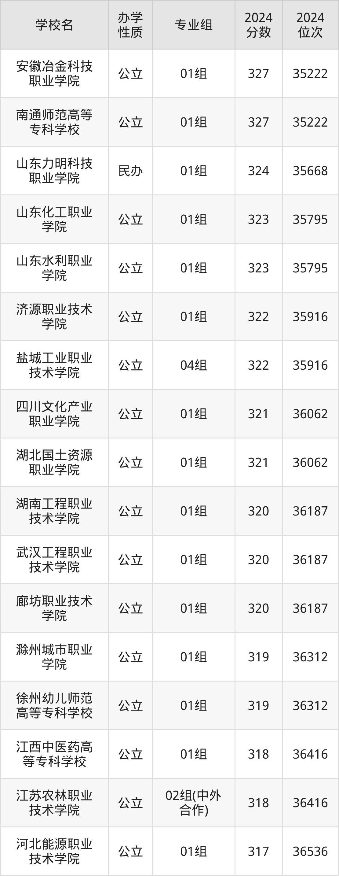 2024年江苏历史类322分考生能上安徽冶金科技职业学院、南通师范高等专科学校、山东力明科技职业学院、山东化工职业学院、山东水利职业学院等17所专科院校,具体录取分数线及位次为: