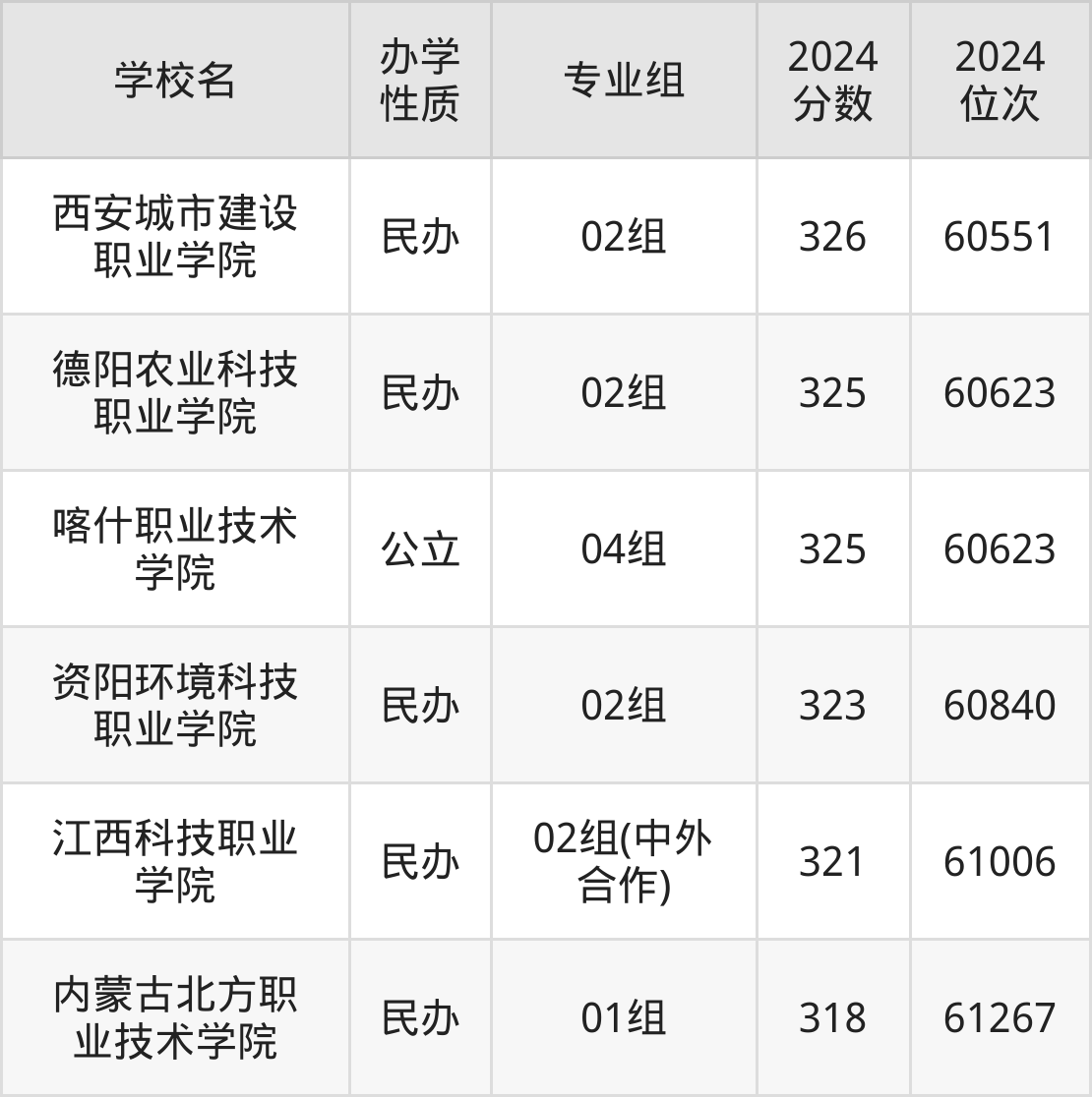 2024年江苏物理类322分考生能上西安城市建设职业学院、德阳农业科技职业学院、喀什职业技术学院、资阳环境科技职业学院、江西科技职业学院等6所专科院校,具体录取分数线及位次为: