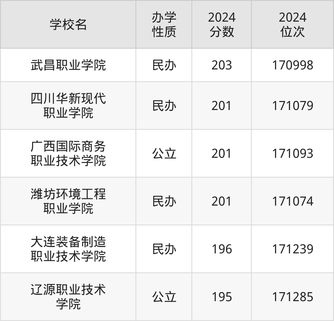 2024年陕西理科200分考生能上武昌职业学院、四川华新现代职业学院、广西国际商务职业技术学院、潍坊环境工程职业学院、大连装备制造职业技术学院等6所专科院校,具体录取分数线及位次为:
