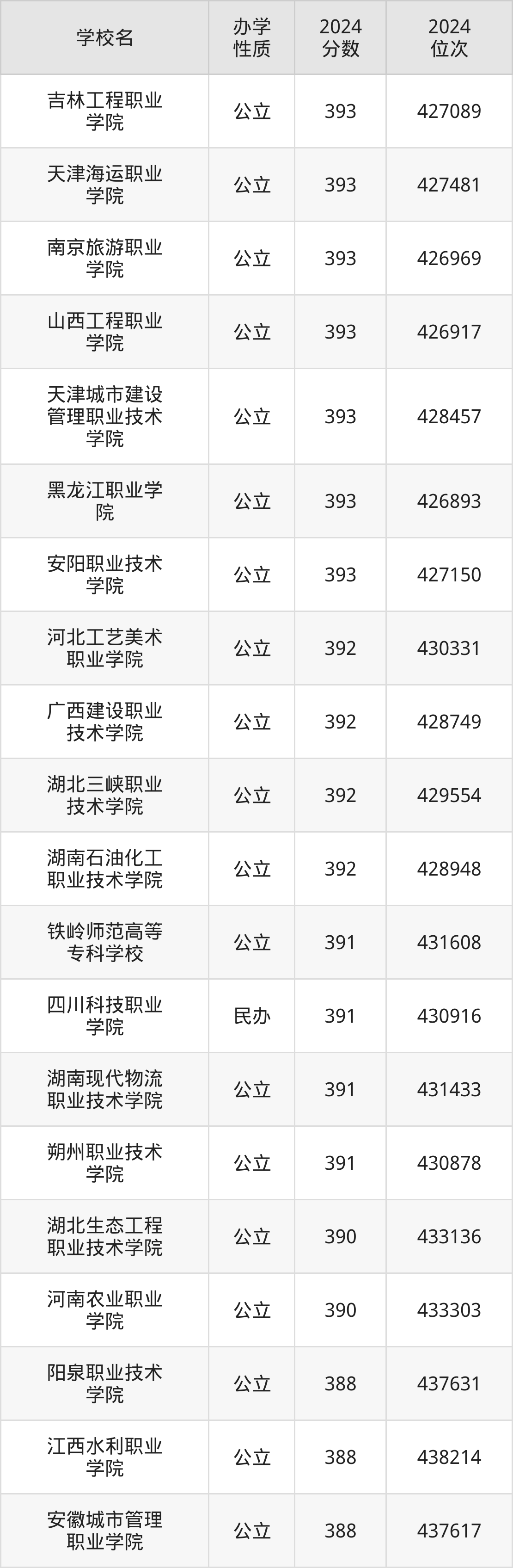 2024年山东388分考生能上吉林工程职业学院、天津海运职业学院、南京旅游职业学院、山西工程职业学院、天津城市建设管理职业技术学院等35所专科院校,具体录取分数线及位次为:
