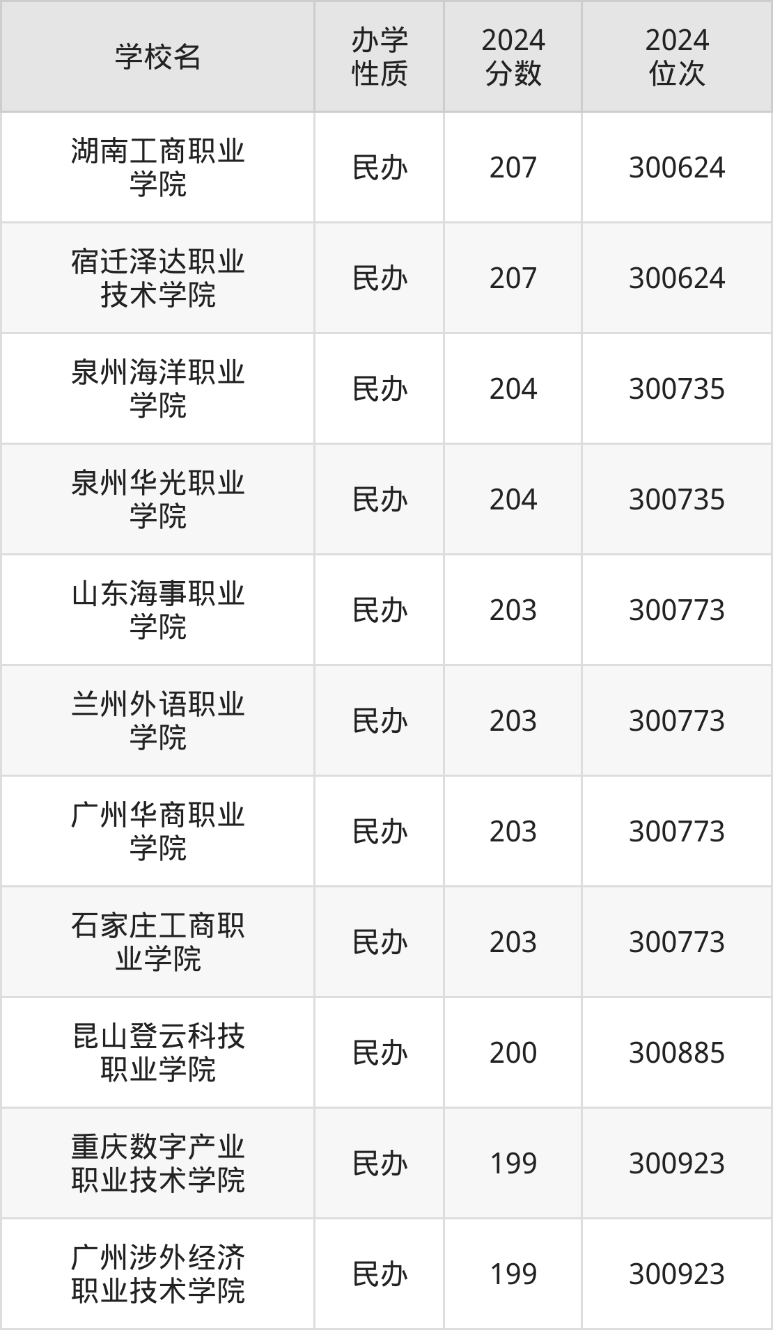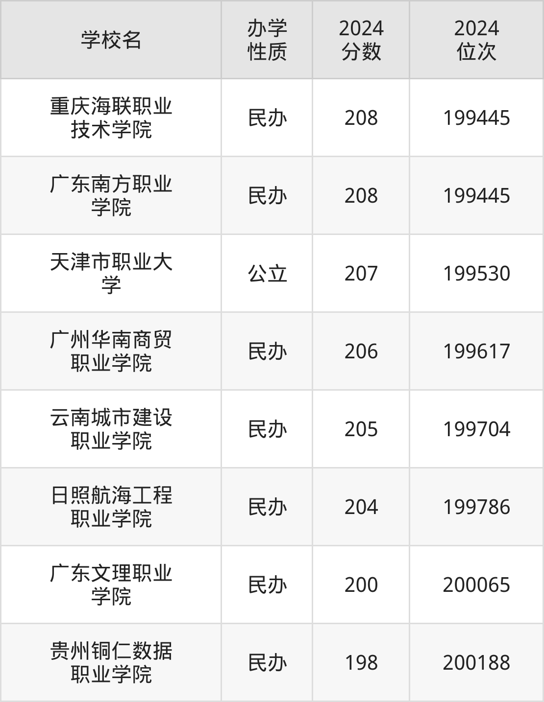 2024年四川文科203分考生能上重庆海联职业技术学院、广东南方职业学院、天津市职业大学、广州华南商贸职业学院、云南城市建设职业学院等8所专科院校,具体录取分数线及位次为: