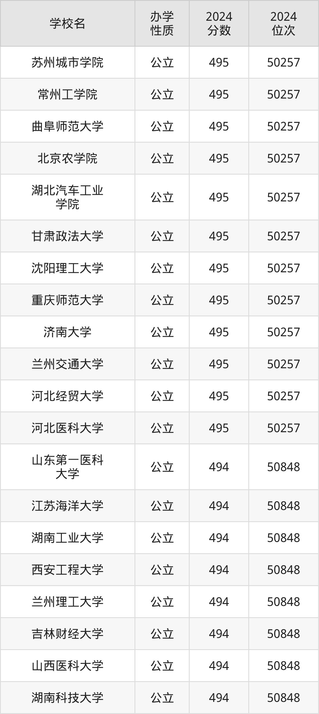 2024年山西理科490分考生能上苏州城市学院、常州工学院、北京农学院、湖北汽车工业学院、甘肃政法大学等58所二本院校,具体录取分数线及位次为: