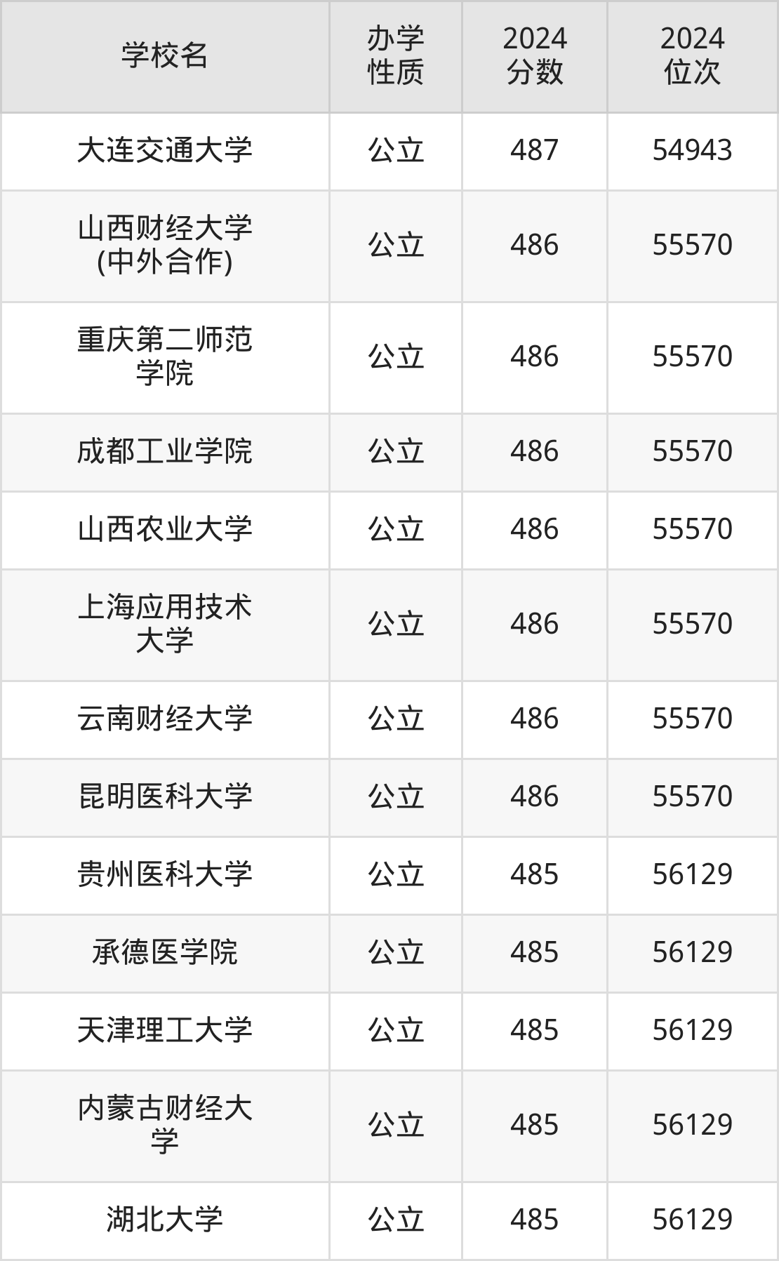| 内蒙古财经大 学 | 485 | 56129 |