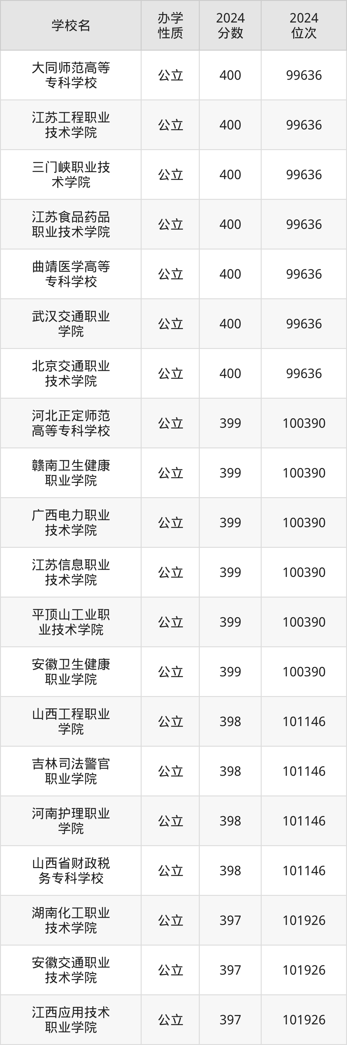 | 赣南卫生健康 职业学院 | 399 | 100390 |