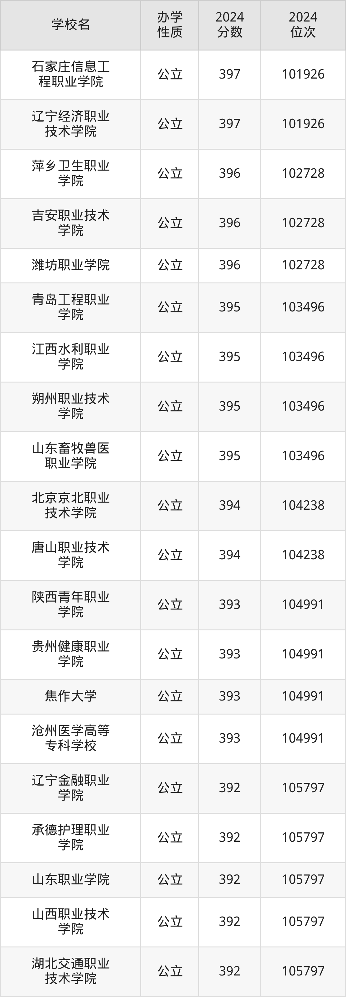 | 萍乡卫生职业 学院 | 396 | 102728 |