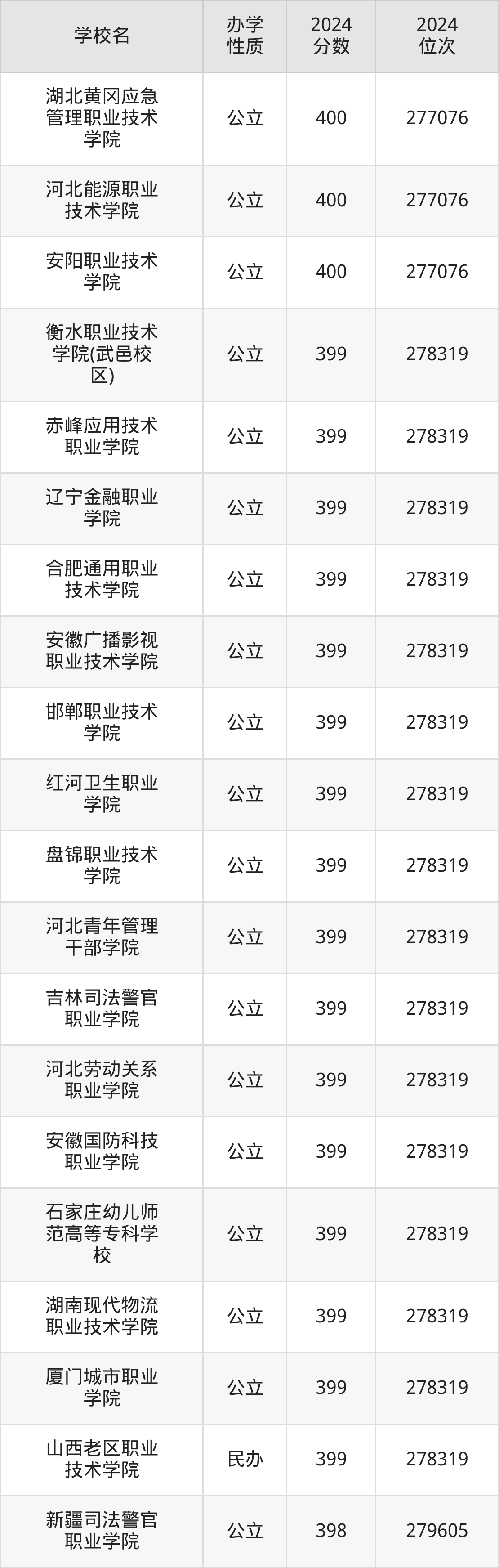 | 河北劳动关系 职业学院 | 399 | 278319 |