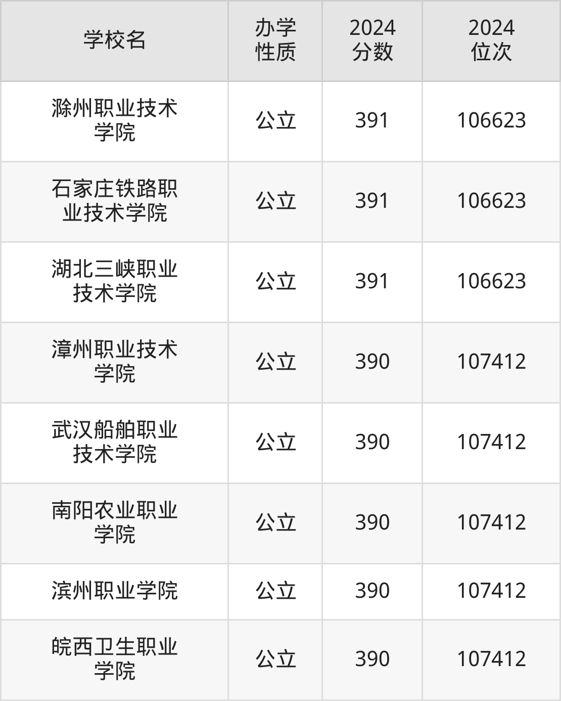 | 皖西卫生职业 学院 | 390 | 107412 |