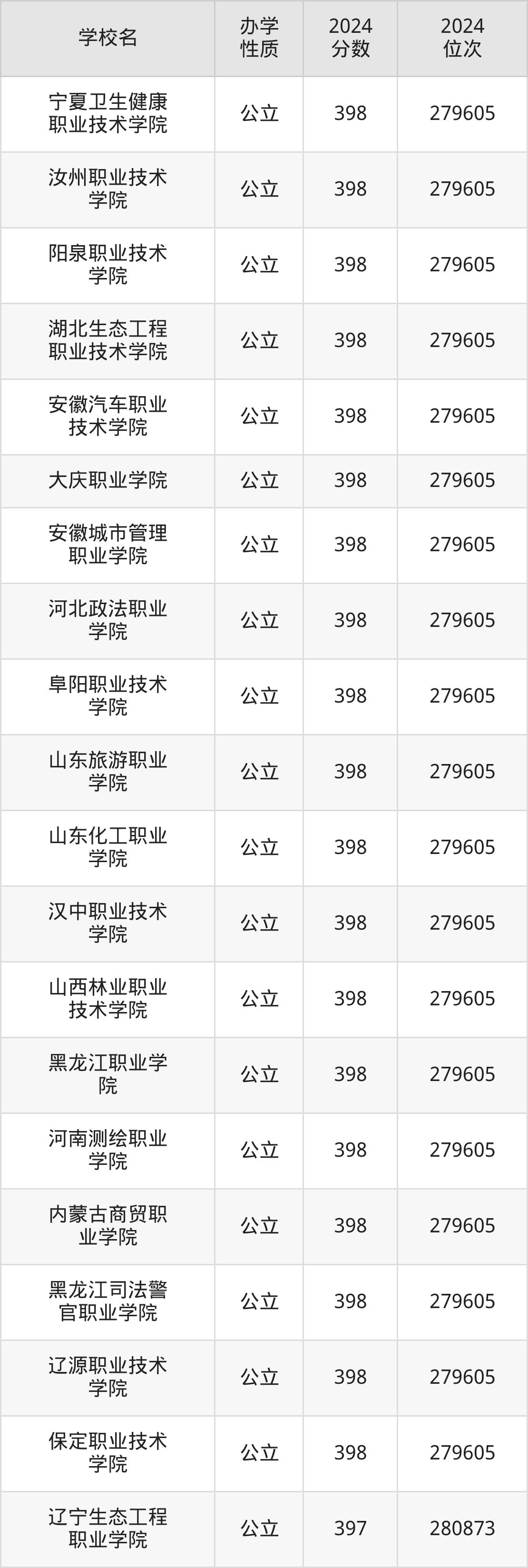 | 宁夏卫生健康 职业技术学院 | 398 | 279605 |