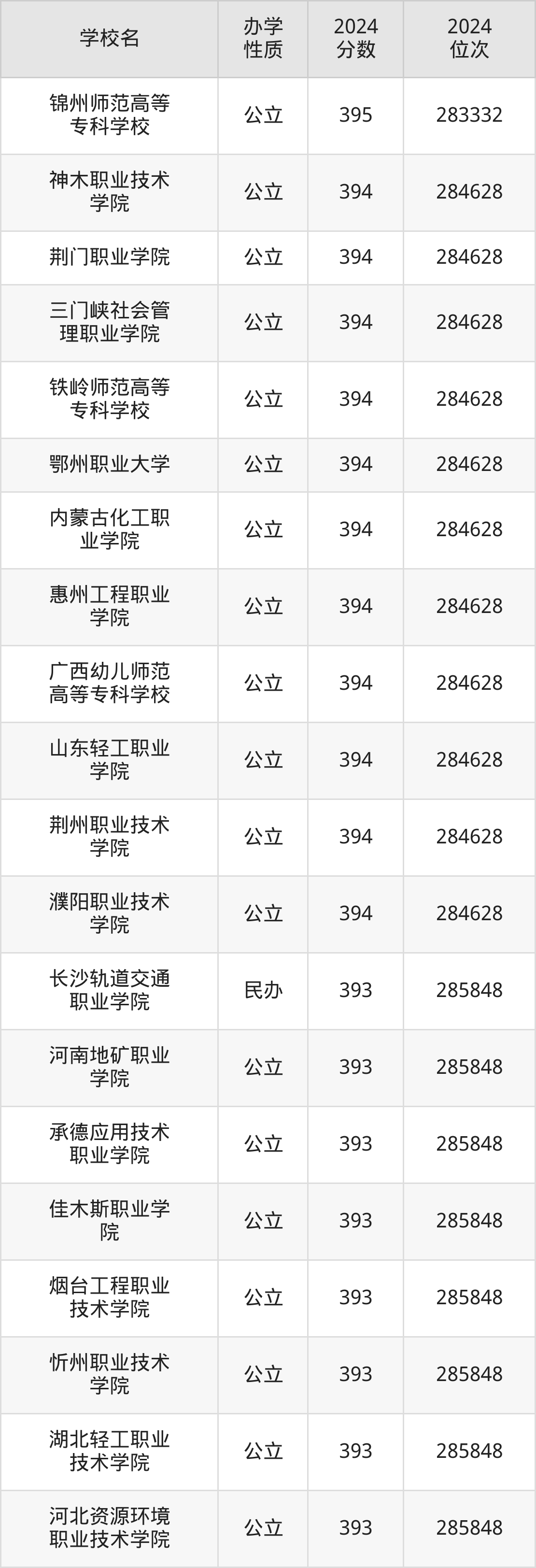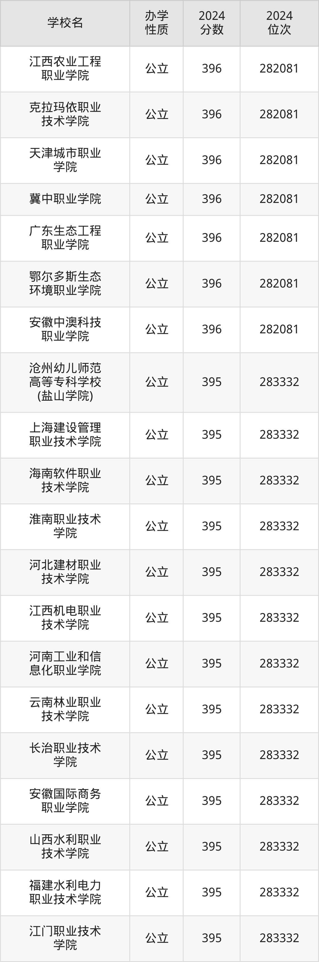 | 福建水利电力 职业技术学院 | 395 | 283332 |