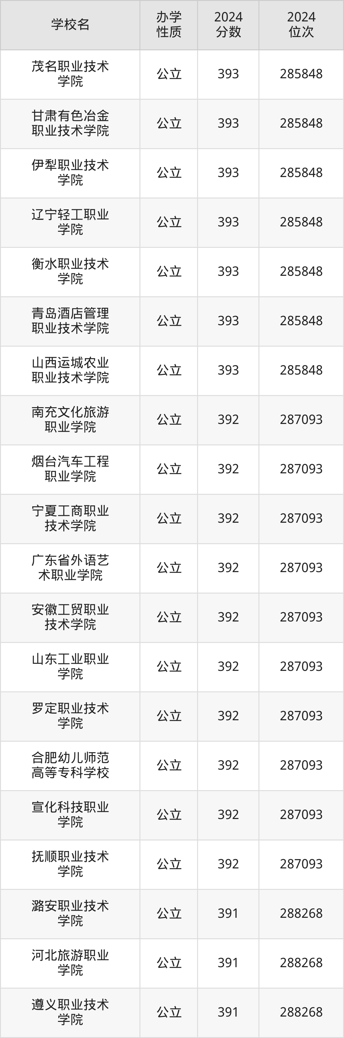 | 甘肃有色冶金 职业技术学院 | 393 | 285848 |