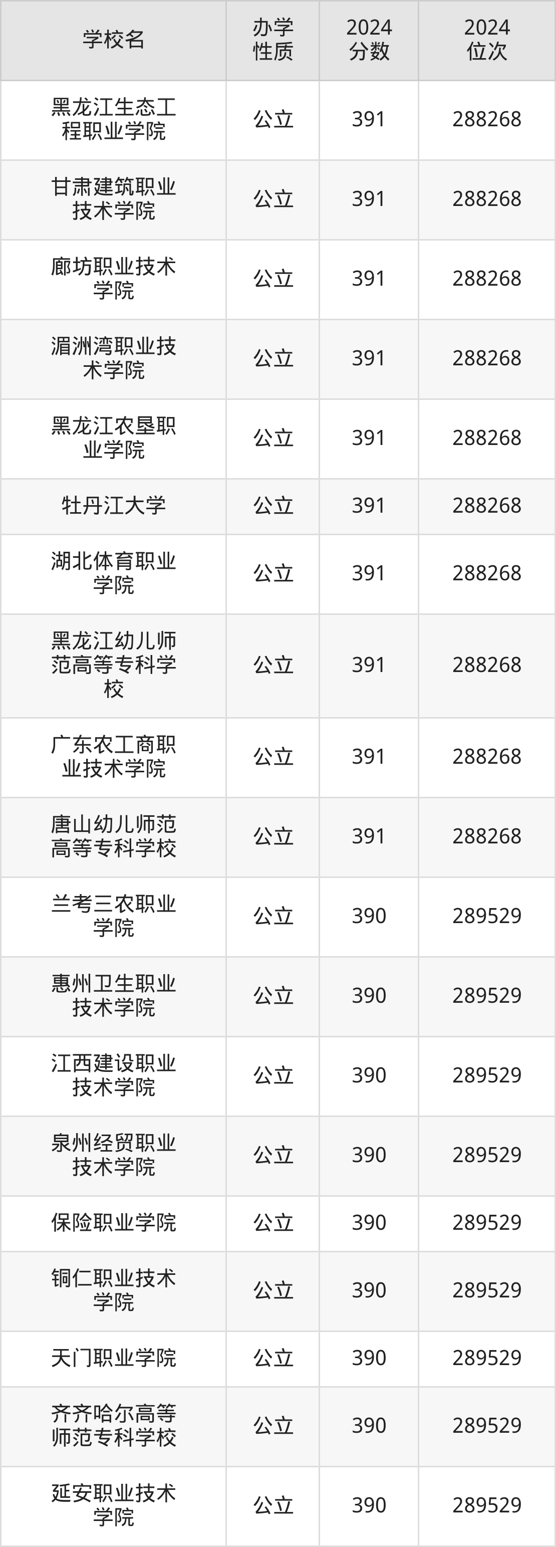 | 黑龙江生态工 程职业学院 | 391 | 288268 |