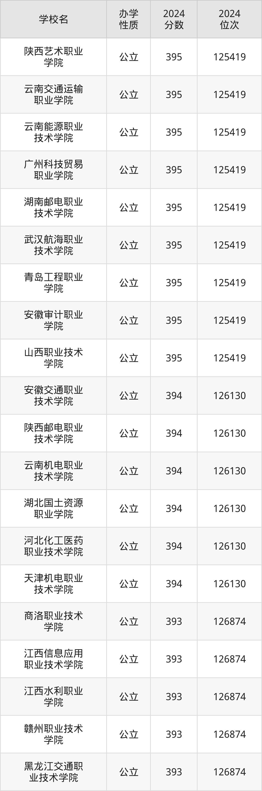 | 陕西艺术职业 学院 | 395 | 125419 |