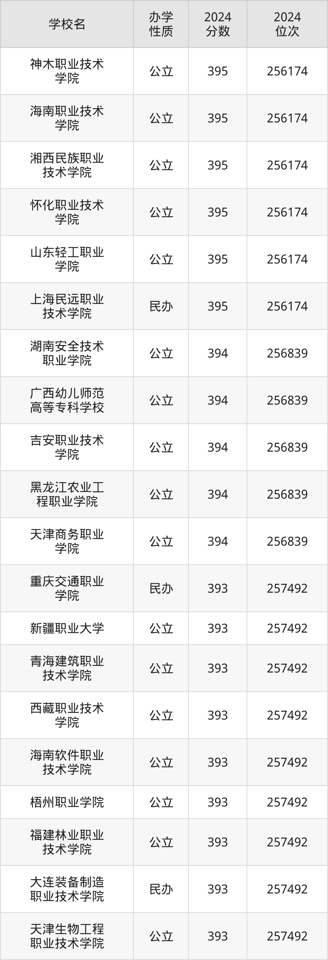 | 海南职业技术 学院 | 395 | 256174 |