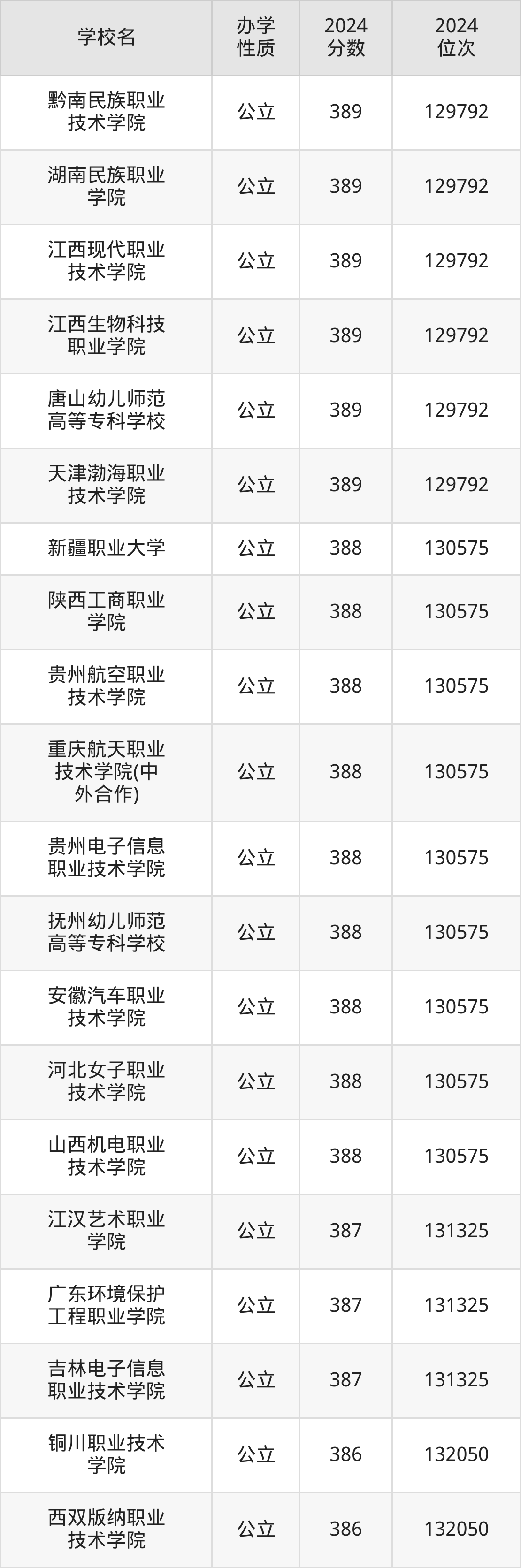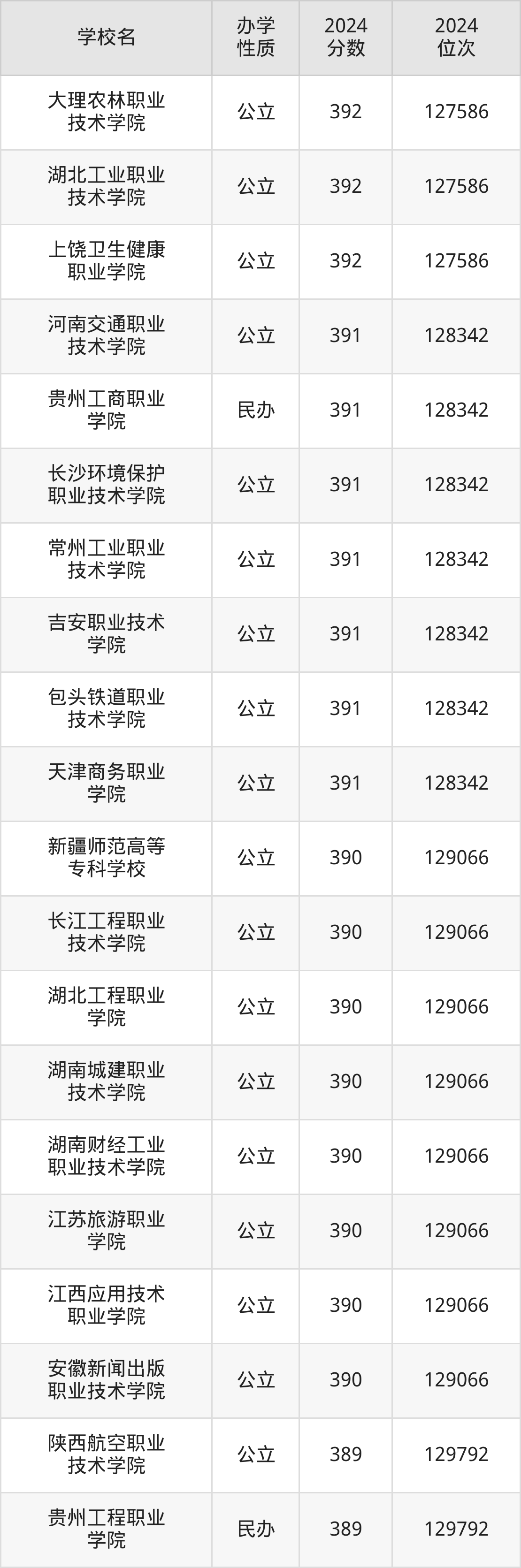 | 湖北工程职业 学院 | 390 | 129066 |