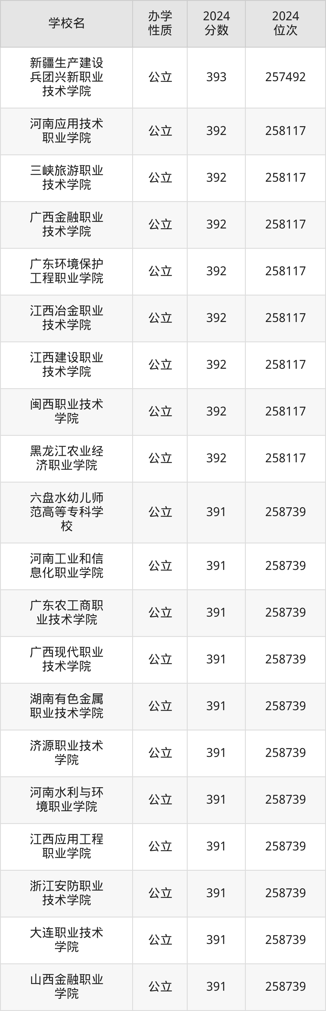 | 山西金融职业 学院 | 391 | 258739 |