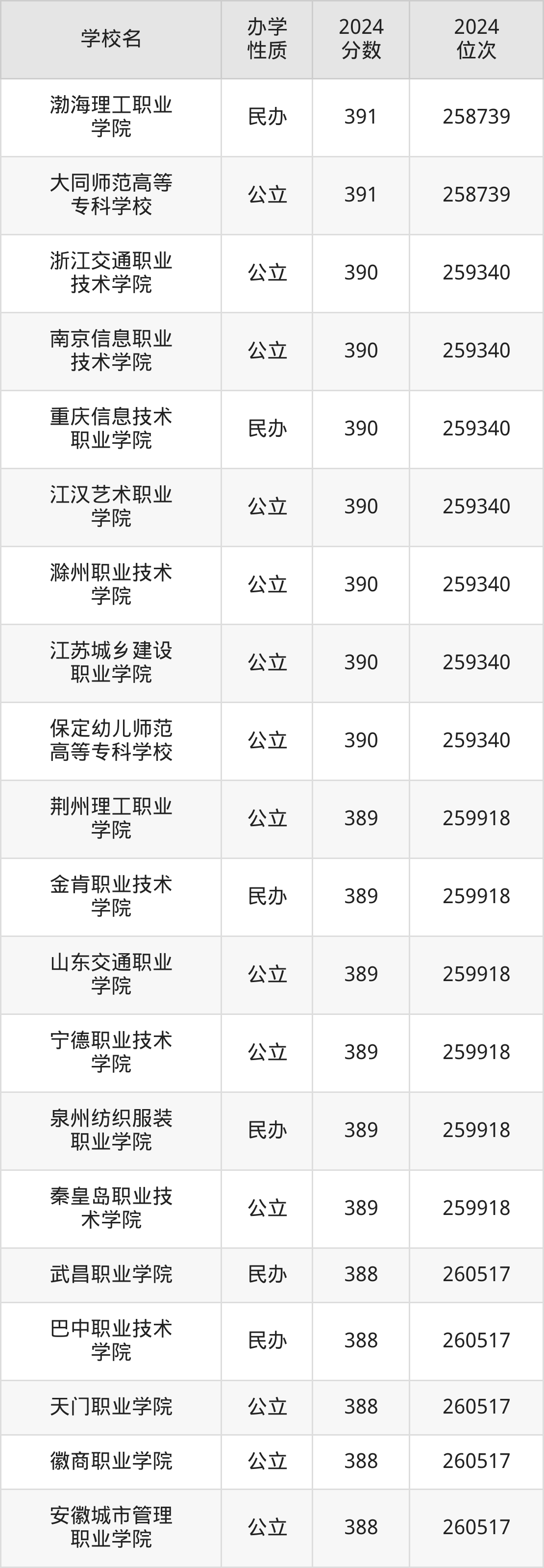 | 安徽城市管理 职业学院 | 388 | 260517 |