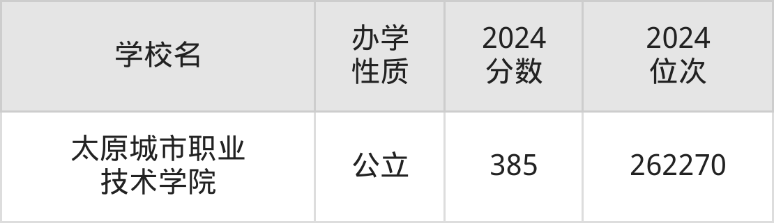 | 太原城市职业 技术学院 | 385 | 262270 |