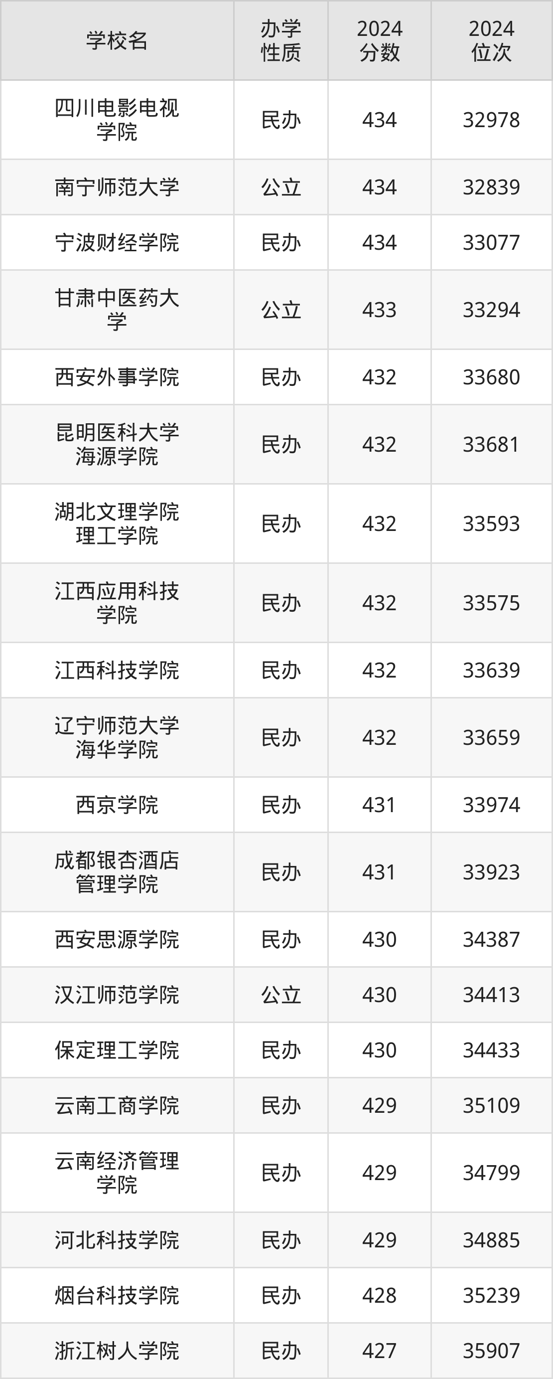 2024年陕西文科429分考生能上四川电影电视学院、南宁师范大学、宁波财经学院、甘肃中医药大学、西安外事学院等23所二本院校,具体录取分数线及位次为: