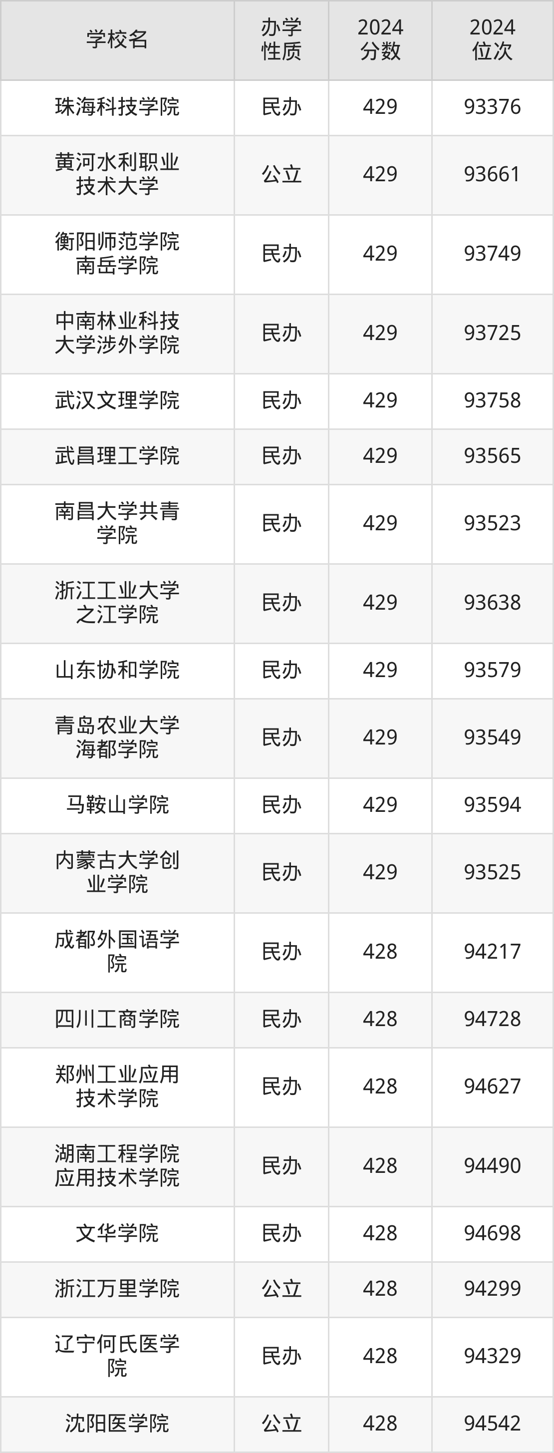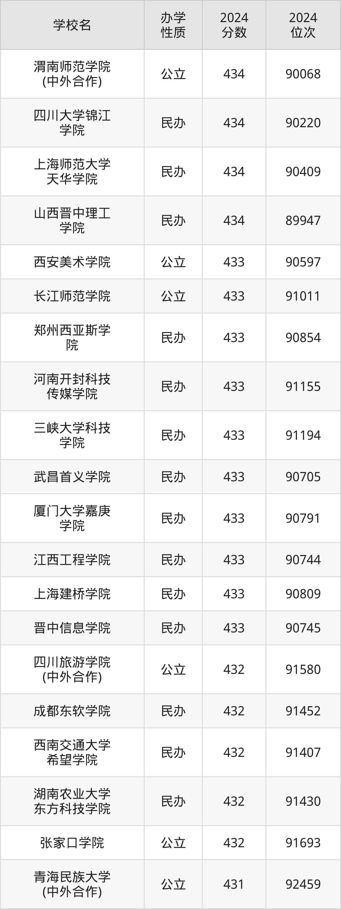 | 河南开封科技 传媒学院 | 433 | 91155 |