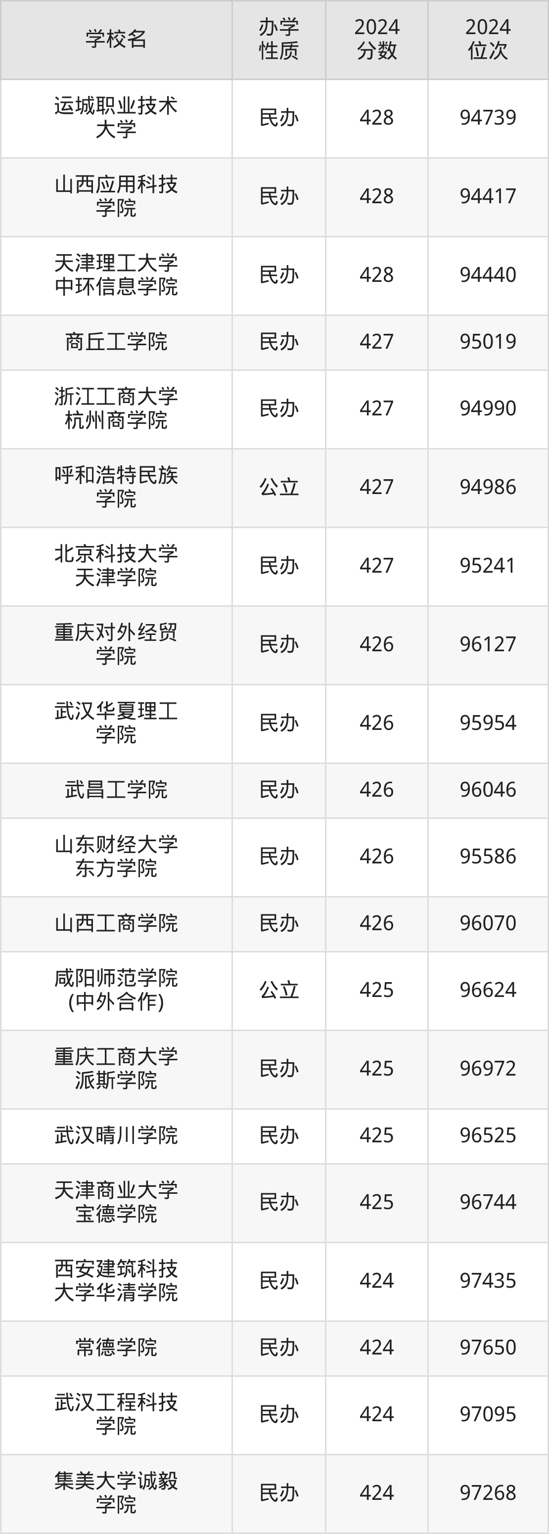 | 西安建筑科技 大学华清学院 | 424 | 97435 |