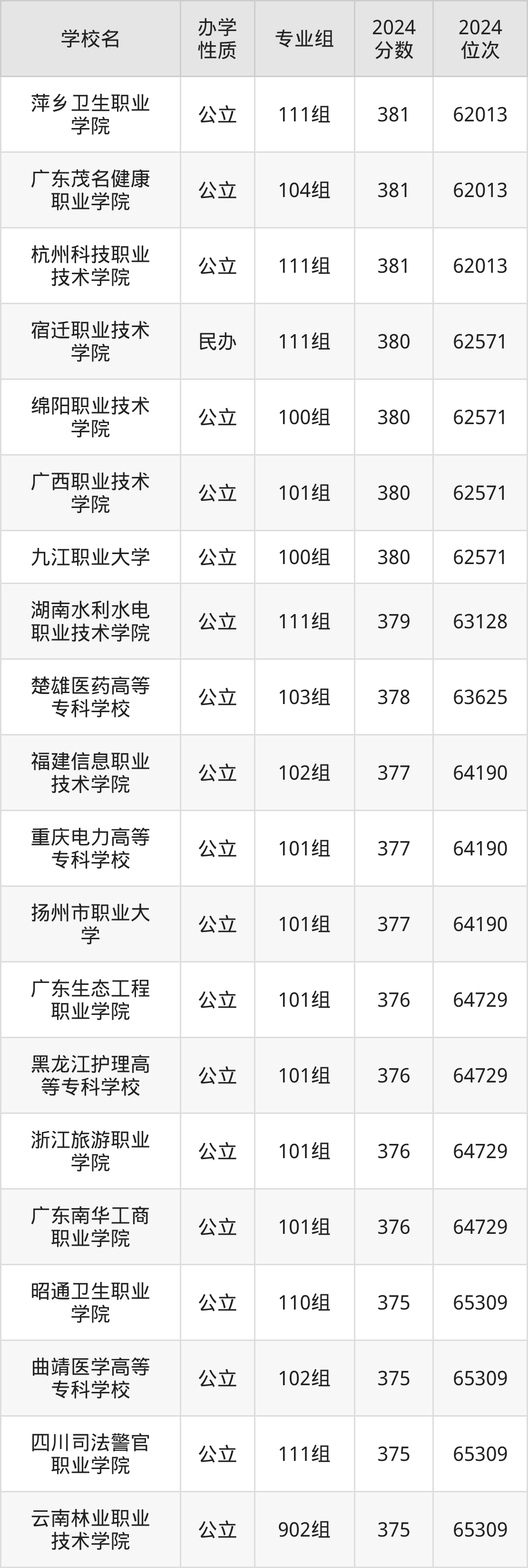 2024年广西历史类376分考生能上萍乡卫生职业学院、广东茂名健康职业学院、杭州科技职业技术学院、宿迁职业技术学院、绵阳职业技术学院等38所专科院校,具体录取分数线及位次为: