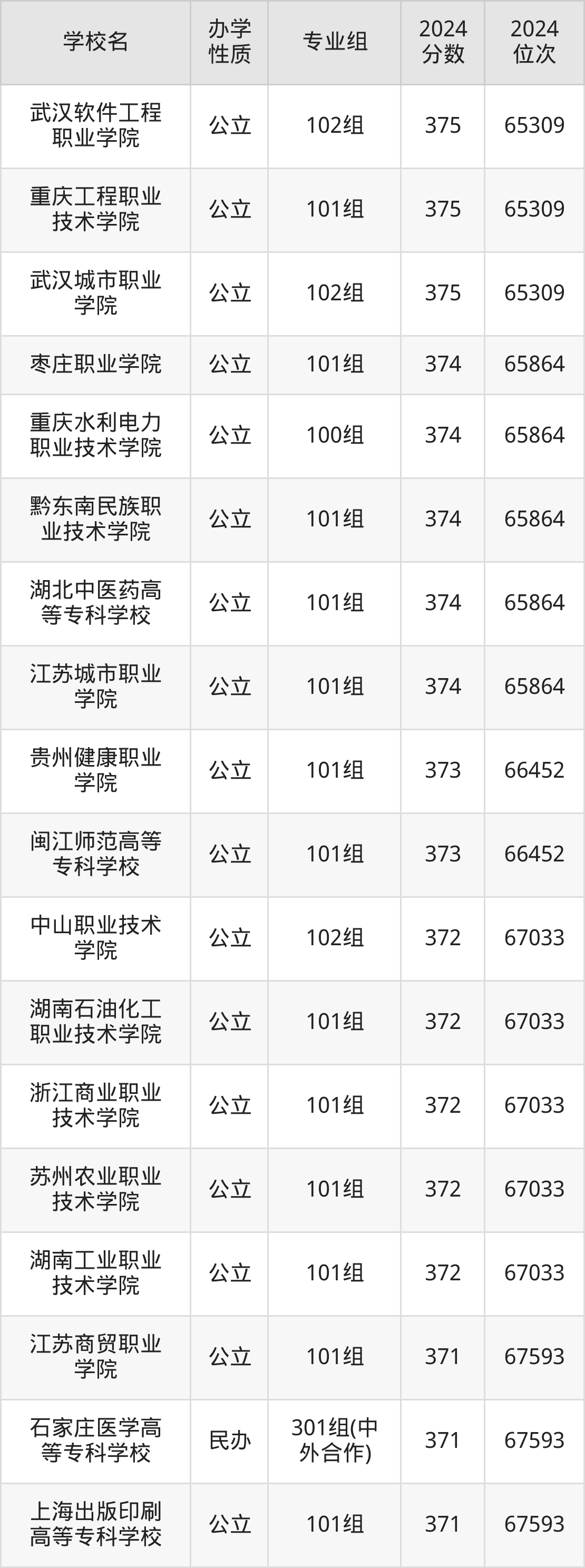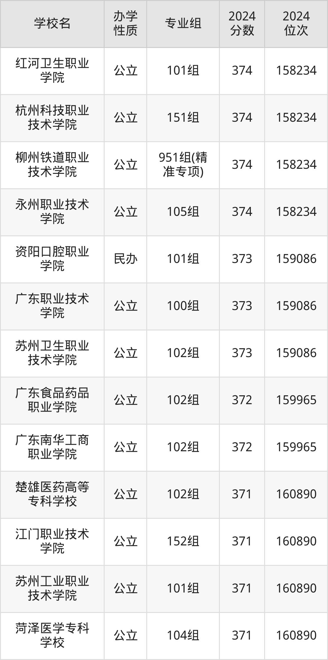 广西壮族自治区376分能上专科大学,比如萍乡卫生职业学院、广东茂名健康职业学院、杭州科技职业技术学院等,更多名单可以在下文了解。