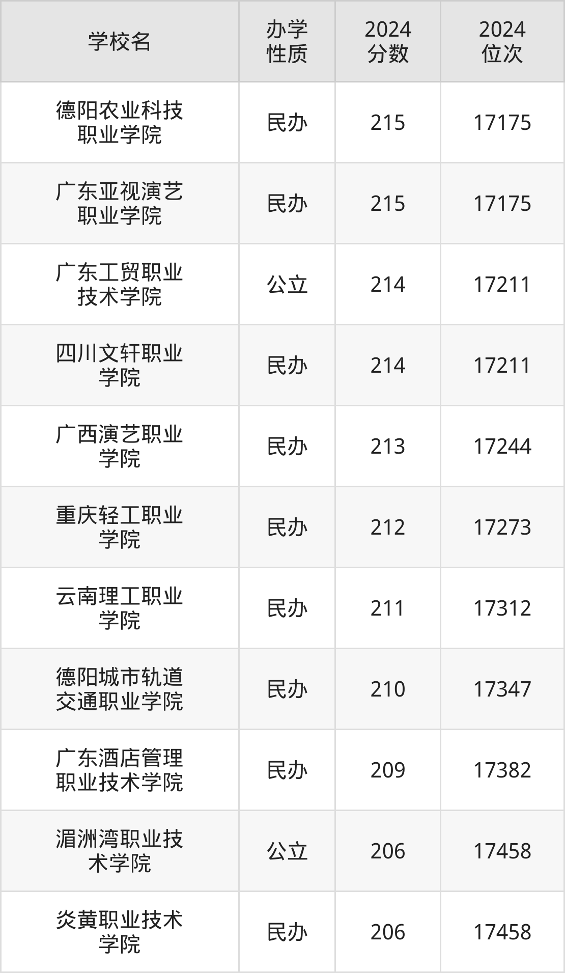 2024年青海文科211分考生能上德阳农业科技职业学院、广东亚视演艺职业学院、广东工贸职业技术学院、四川文轩职业学院、广西演艺职业学院等11所专科院校,具体录取分数线及位次为:
