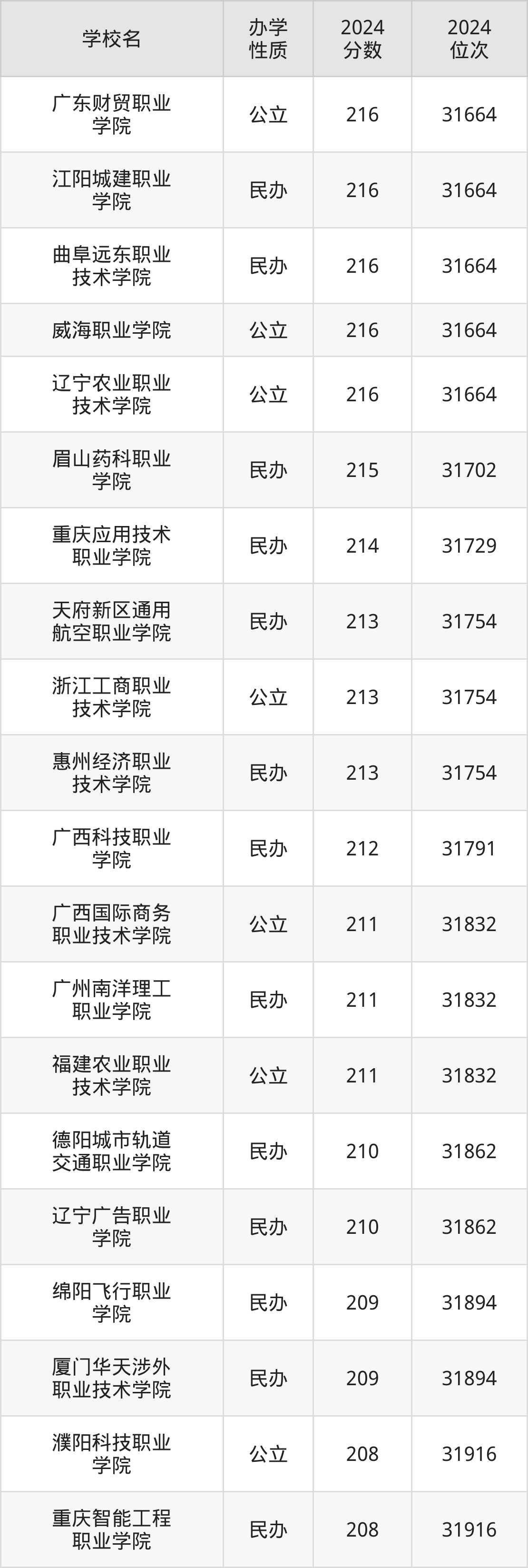2024年青海理科211分考生能上广东财贸职业学院、江阳城建职业学院、曲阜远东职业技术学院、威海职业学院、辽宁农业职业技术学院等21所专科院校,具体录取分数线及位次为: