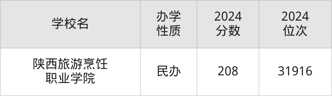 | 陕西旅游烹饪 职业学院 | 208 | 31916 |
