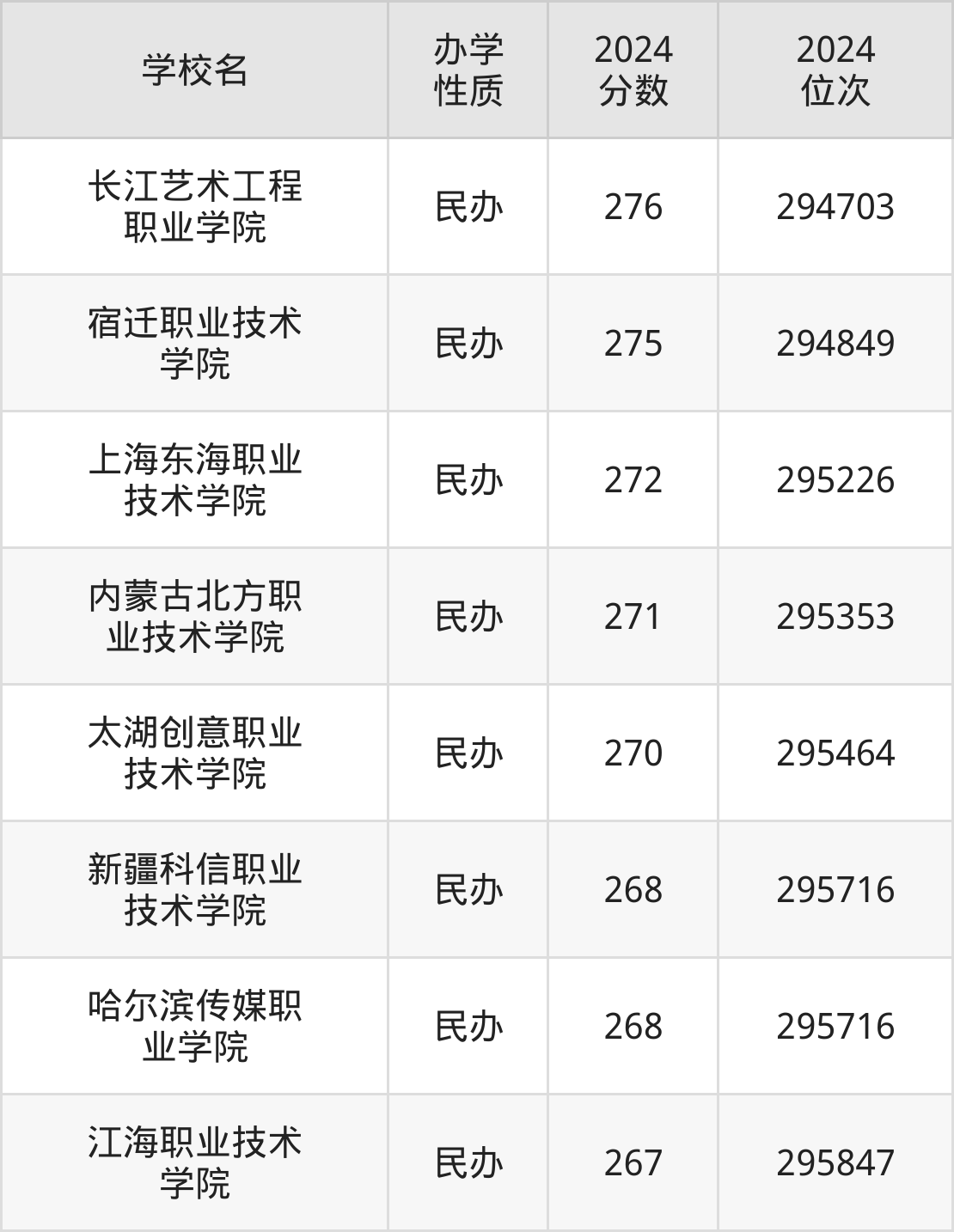 | 太湖创意职业 技术学院 | 270 | 295464 |