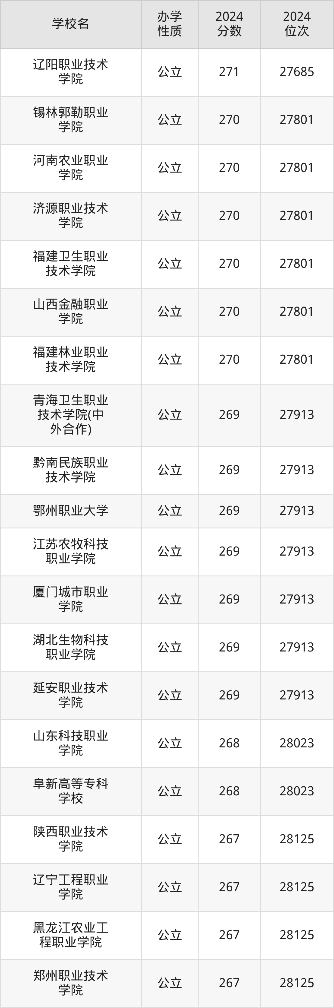 | 辽阳职业技术 学院 | 271 | 27685 |