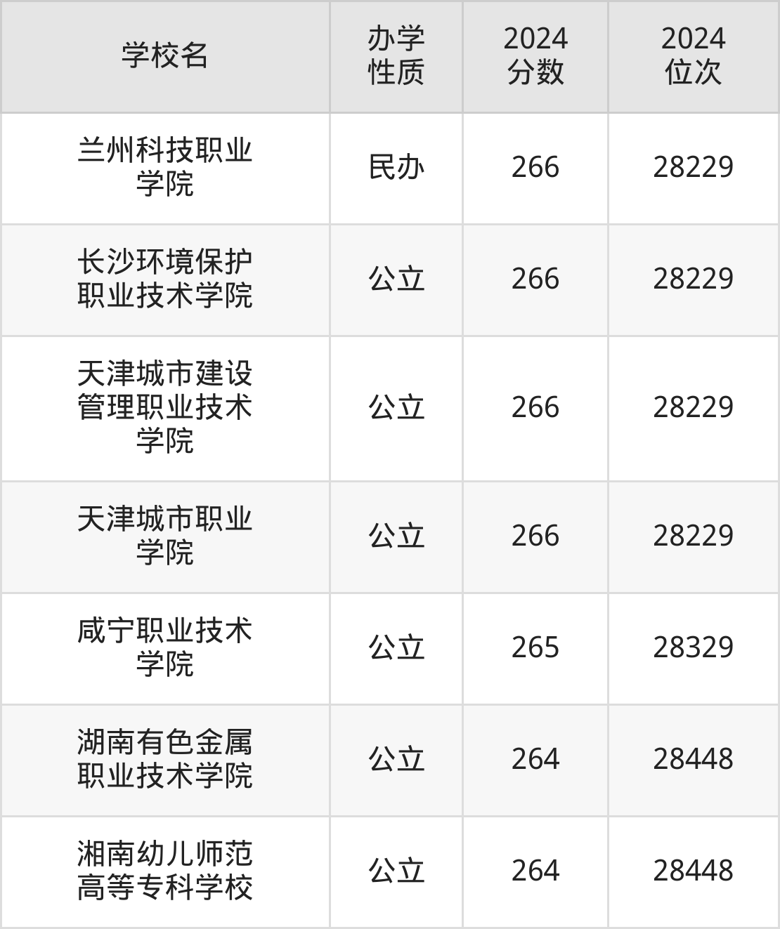 | 长沙环境保护 职业技术学院 | 266 | 28229 |