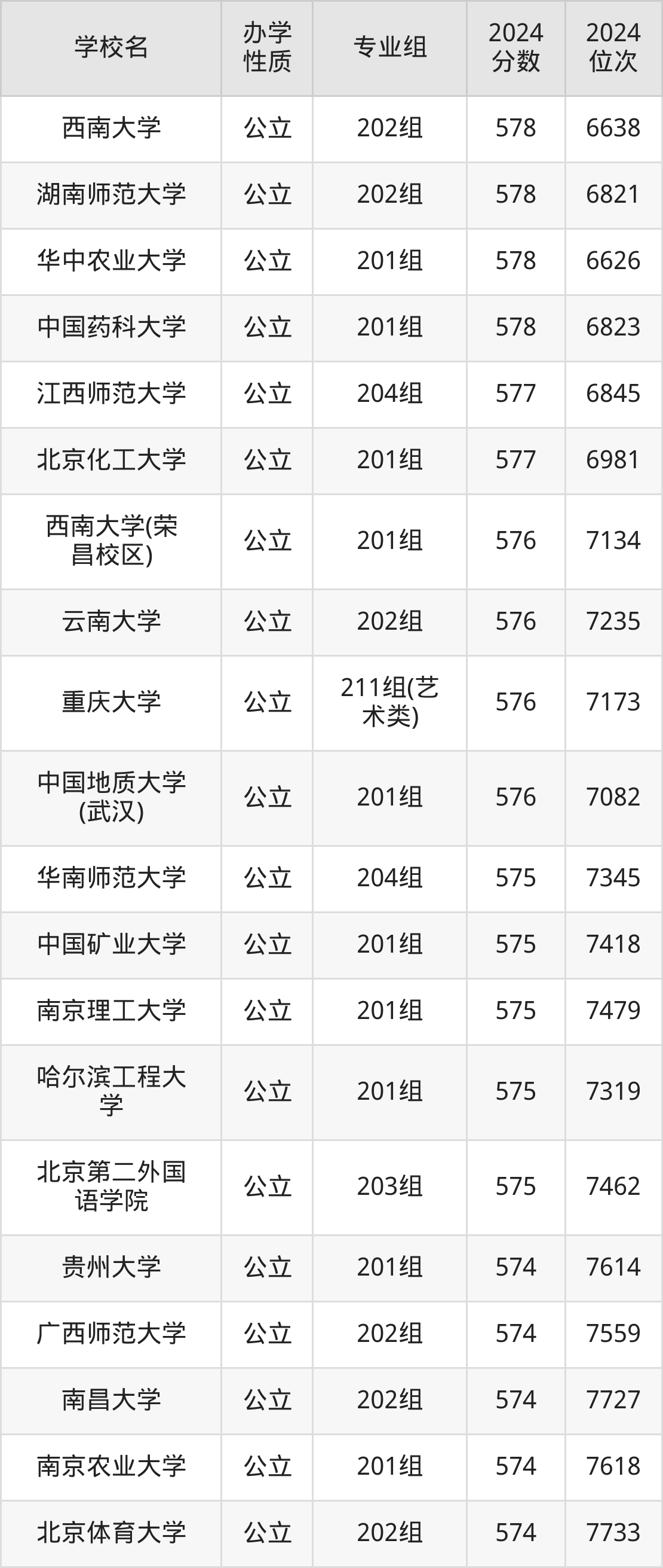| 西南大学 | 214组(中 外合作) | 574 | 42846 |