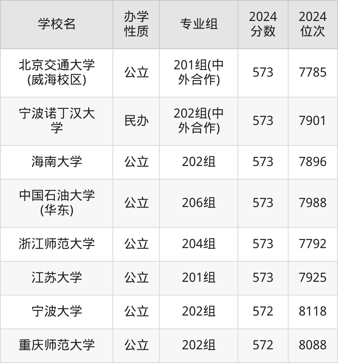 | 北京交通大学 (威海校区) | 201组(中 外合作) | 573 | 7785 |