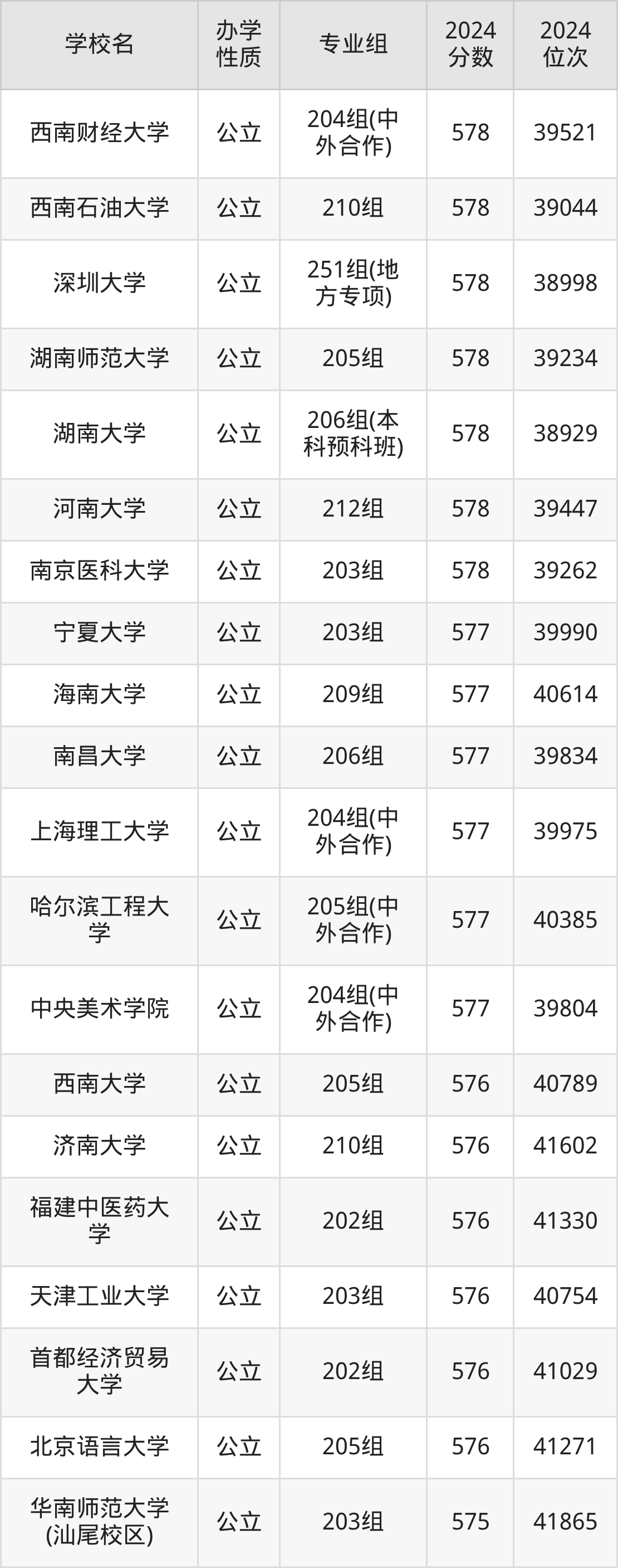 | 西南财经大学 | 204组(中 外合作) | 578 | 39521 |
