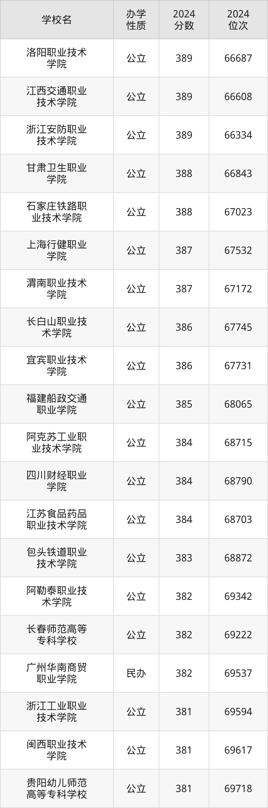 | 洛阳职业技术 学院 | 389 | 66687 |