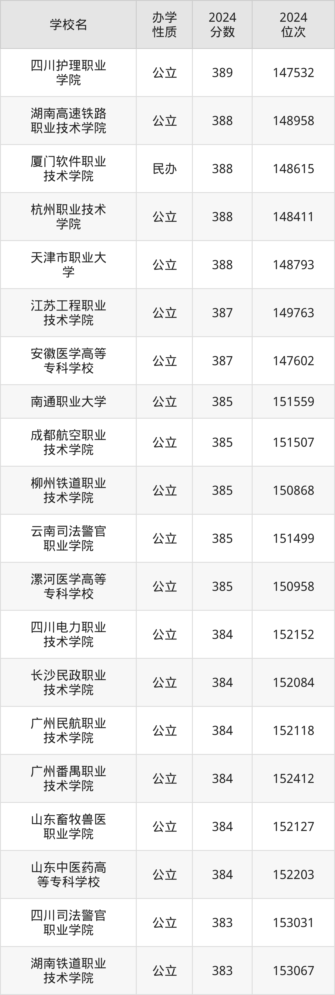 | 四川护理职业 学院 | 389 | 147532 |