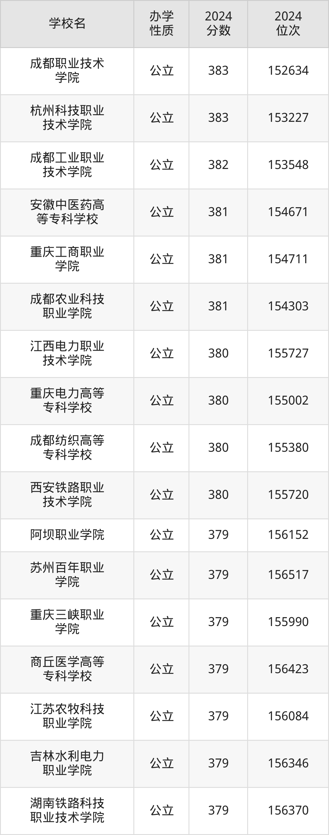 | 成都职业技术 学院 | 383 | 152634 |