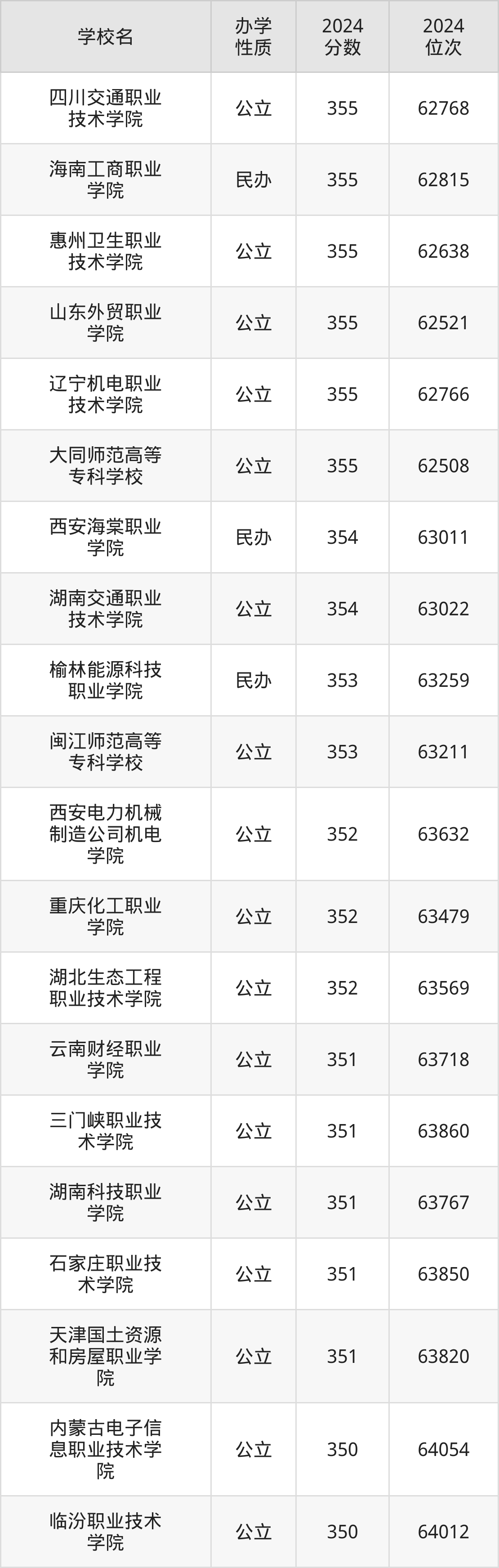 2024年陕西文科350分考生能上四川交通职业技术学院、海南工商职业学院、惠州卫生职业技术学院、山东外贸职业学院、辽宁机电职业技术学院等41所专科院校,具体录取分数线及位次为: