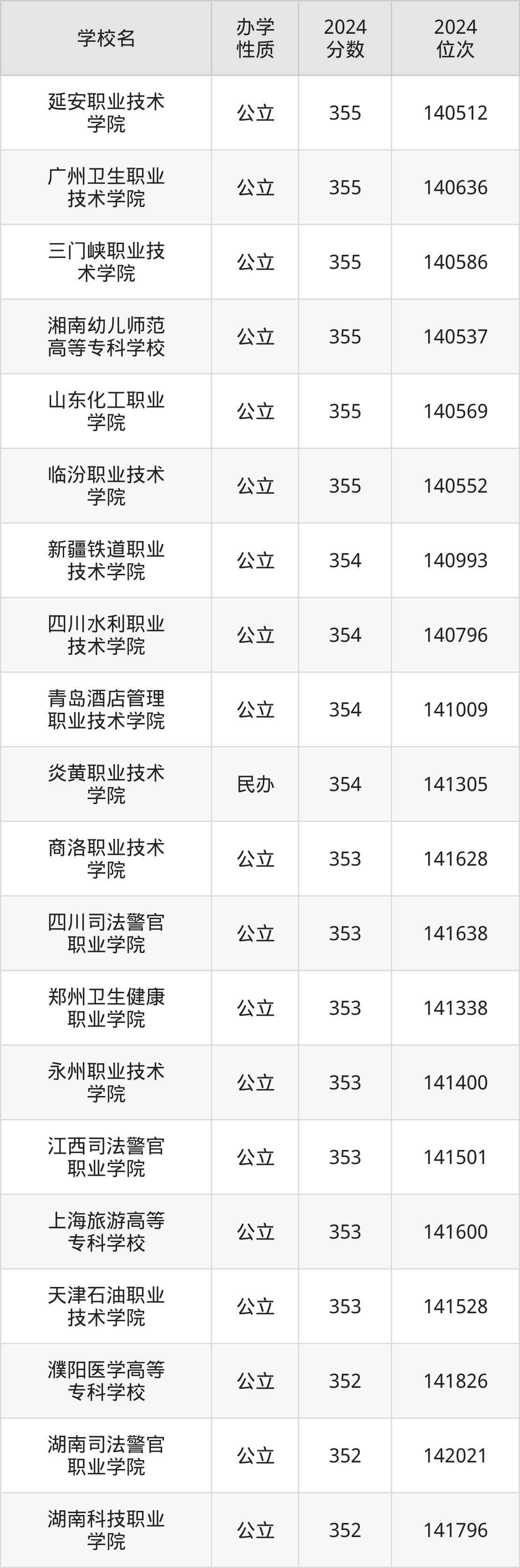 2024年陕西理科350分考生能上延安职业技术学院、广州卫生职业技术学院、三门峡职业技术学院、湘南幼儿师范高等专科学校、山东化工职业学院等58所专科院校,具体录取分数线及位次为: